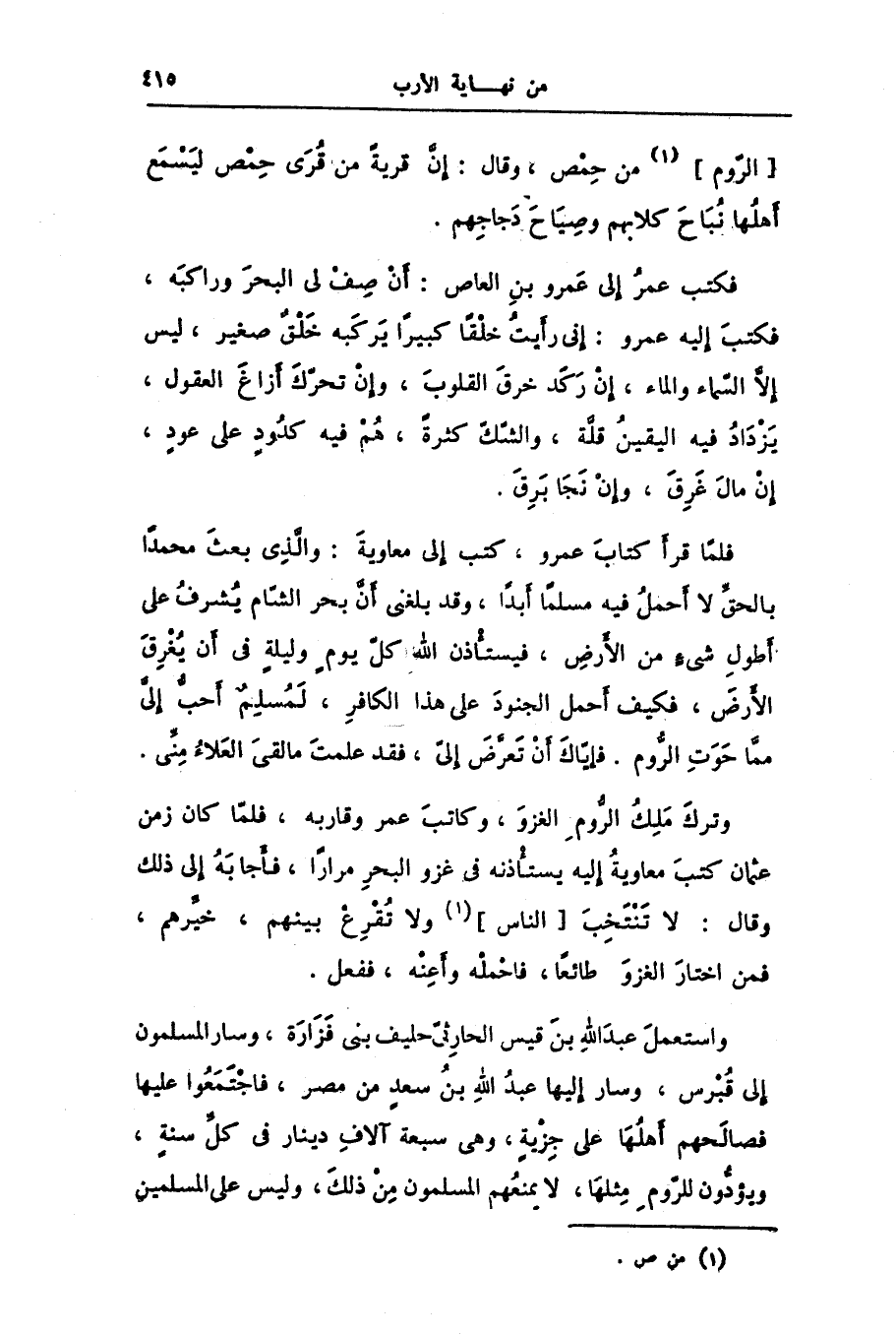 وترك ملك الرّوم الغزو، وكاتب عمر وقاربه، فلمّا كان زمن عثمان كتب معاوية إليه يستأذنه فى غزو البحر مرارا، فأجابه إلى ذلك وقال: لا تنتخب [الناس] [1] ولا تقرع بينهم، خيّرهم، فمن اختار الغزو طائعا، فاحمله وأعنه، ففعل.