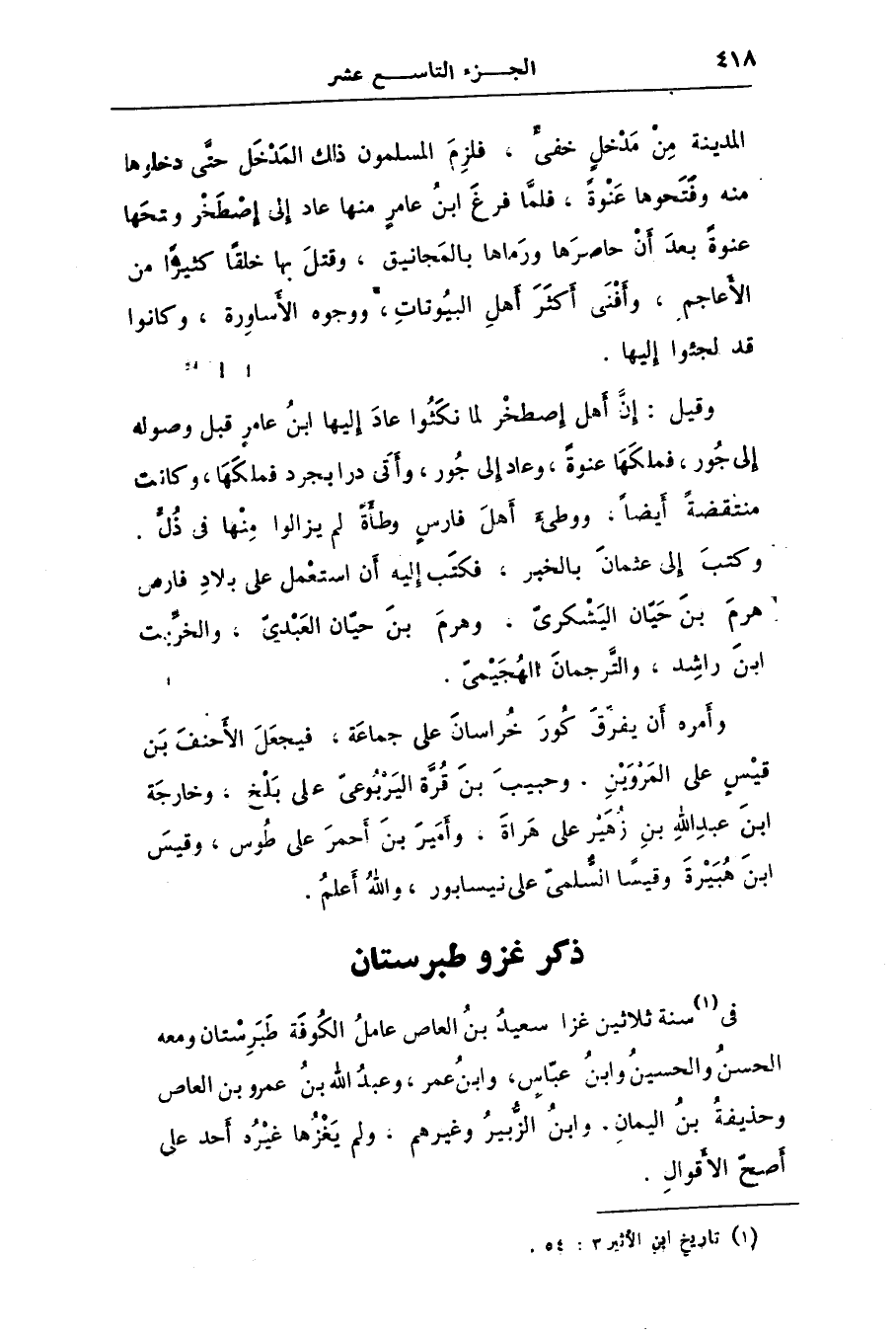 فى [1] سنة ثلاثين غزا سعيد بن العاص عامل الكوفة طبرستان ومعه الحسن والحسين وابن عبّاس، وابن عمر، وعبد الله بن عمرو بن العاص وحذيفة بن اليمان. وابن الزّبير وغيرهم، ولم يغزها غيره أحد على أصحّ الأقوال.