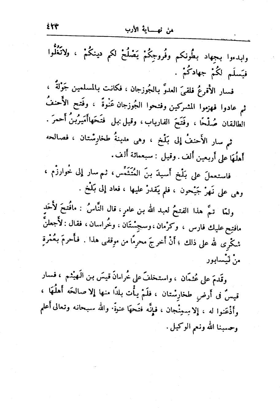 ولمّا تمّ هذا الفتح لعبد الله بن عامر، قال النّاس: ما فتح لأحد ما فتح عليك فارس، وكرمان، وسجستان، وخراسان، فقال: لأجعلنّ شكرى لله على ذلك؛ أن أخرج محرما من موقفى هذا. فأحرم بعمرة من نيسابور وقدم على عثمان، واستخلف على خراسان قيس بن الهيثم، فسار قيس فى أرض طخارستان، فلم يأت بلدا منها إلا صالحه أهلها، وأذعنوا له، إلا سمنجان، فإنّه فتحها عنوة. والله سبحانه وتعالى أعلم وحسبنا الله ونعم الوكيل.