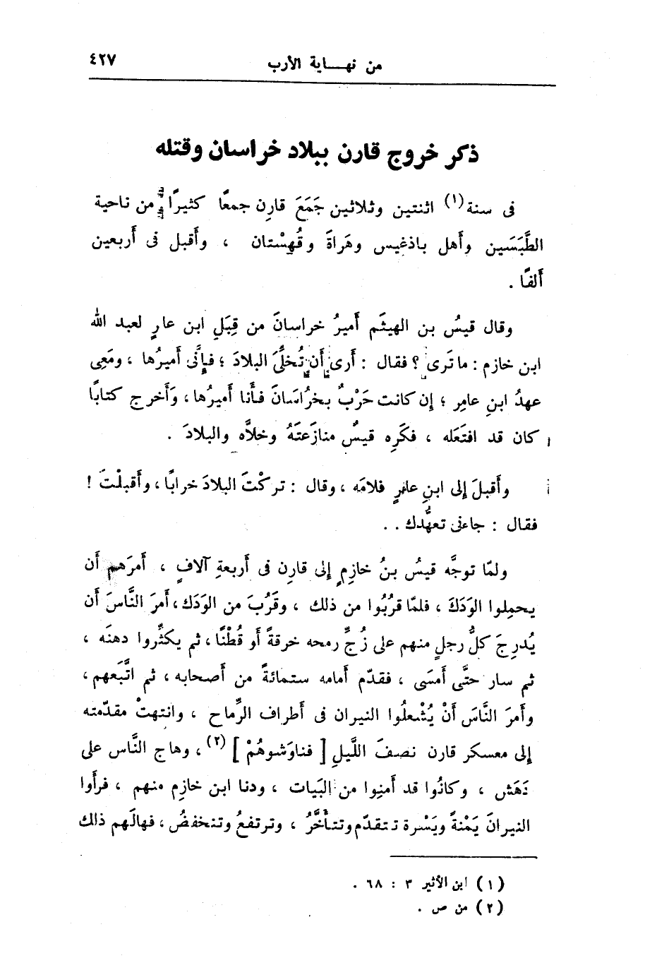 ولمّا توجّه قيس بن خازم إلى قارن فى أربعة آلاف، أمرهم أن يحملوا الودك، فلمّا قربوا من ذلك، وقرب من الودك، أمر النّاس أن يدرج كلّ رجل منهم على زجّ رمحه خرقة أو قطنا، ثم يكثّروا دهنه، ثم سار حتّى أمسى، فقدّم أمامه ستمائة من أصحابه، ثم اتّبعهم، وأمر النّاس أن يشعلوا النيران فى أطراف الرّماح، وانتهت مقدّمته إلى معسكر قارن نصف اللّيل [فناوشوهم] [2] ، وهاج النّاس على دهش، وكانوا قد أمنوا من البيات، ودنا ابن خازم منهم، فرأوا النيران يمنة ويسرة تتقدّم وتتأخّر، وترتفع وتنخفض، فهالهم ذلك