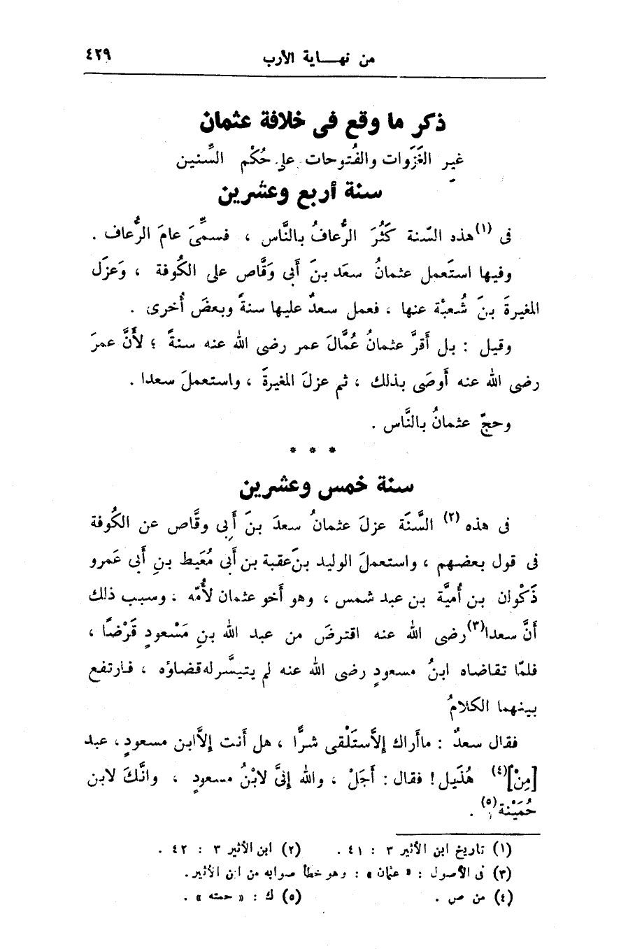 فى هذه [2] السّنة عزل عثمان سعد بن أبى وقّاص عن الكوفة فى قول بعضهم، واستعمل الوليد بن عقبة بن أبى معيط بن أبى عمرو ذكوان بن أميّة بن عبد شمس، وهو أخو عثمان لأمّه، وسبب ذلك أنّ سعدا [3] رضى الله عنه اقترض من عبد الله بن مسعود قرضا، فلمّا تقاضاه ابن مسعود رضى الله عنه لم يتيسّر له قضاؤه، فارتفع بينهما الكلام فقال سعد: ما أراك إلّا ستلقى شرّا، هل أنت إلّا ابن مسعود، عبد [من] [4] هذيل! فقال: أجل، والله إنّى لابن مسعود، وانّك لابن حمينة [5] .