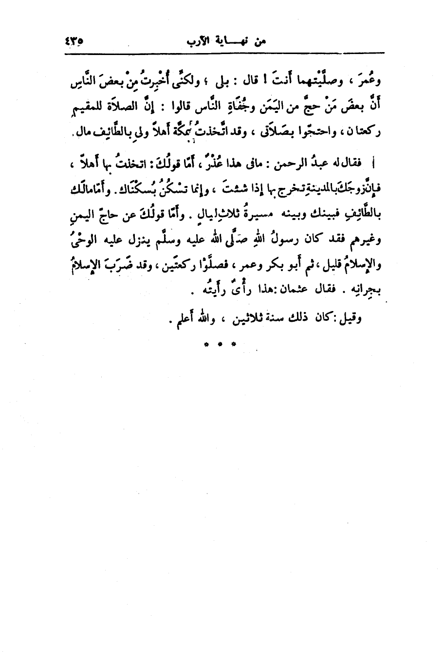 وعمر، وصلّيتهما أنت! قال: بلى؛ ولكنّى أخبرت من بعض النّاس أنّ بعض من حجّ من اليمن وجفاة النّاس قالوا: إنّ الصلاة للمقيم ركعتان، واحتجّوا بصلاتى، وقد اتّخذت بمكّة أهلا ولى بالطّائف مال، فقال له عبد الرحمن: ما فى هذا عذر، أمّا قولك: اتخذت بها أهلا، فإنّ زوجك بالمدينة تخرج بها إذا شئت، وإنما تسكن بسكناك. وأمّا مالك بالطّائف فبينك وبينه مسيرة ثلاث ليال. وأمّا قولك عن حاجّ اليمن وغيرهم فقد كان رسول الله صلّى الله عليه وسلّم ينزل عليه الوحى والإسلام قليل، ثم أبو بكر وعمر، فصلّوا ركعتين، وقد ضرب الإسلام بجرانه. فقال عثمان: هذا رأى رأيته.