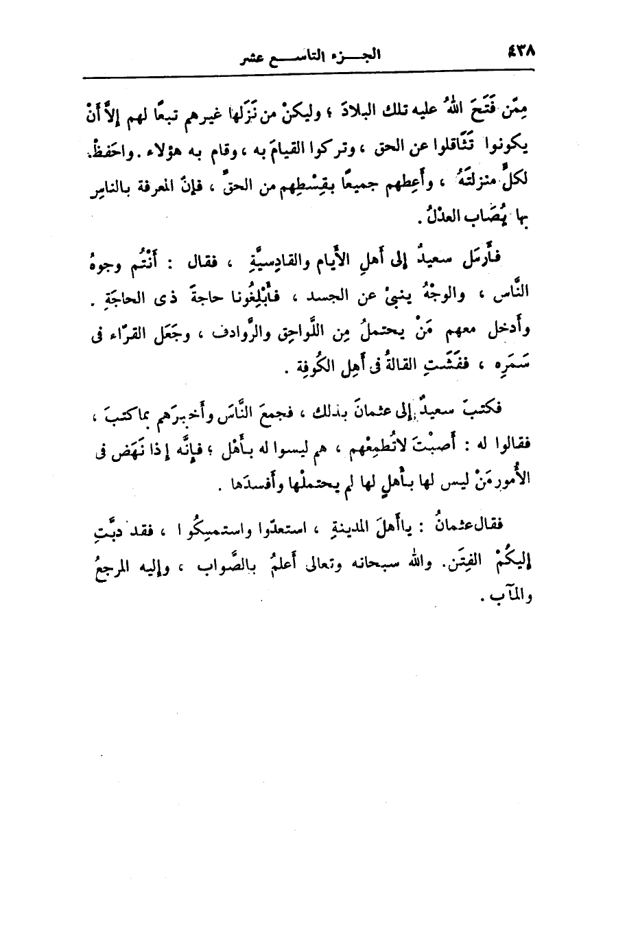 فكتب سعيد إلى عثمان بذلك، فجمع النّاس وأخبرهم بما كتب، فقالوا له: أصبت لا تطمعهم، هم ليسوا له بأهل؛ فإنّه إذا نهض فى الأمور من ليس لها بأهل لها لم يحتملها وأفسدها.