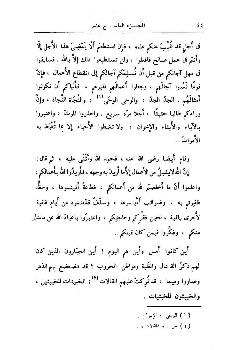 فى أجل قد غيّب عنكم علمه، فإن استطعتم ألّا يمضى هذا الأجل إلّا وأنتم فى عمل صالح فافعلوا، ولن تستيطعوا ذلك إلّا بالله. فسابقوا فى مهل آجالكم من قبل أن تسلمكم آجالكم إلى انقطاع الأعمال، فإنّ قوما نسوا آجالهم، وجعلوا أعمالهم لغيرهم، فأنهاكم أن تكونوا أمثالهم. الجدّ الجدّ، والوحى الوحى [1] ، والنّجاة النّجاة، وإنّ وراءكم طالبا حثيثا، أجلا مرّه سريع. واحذروا الموت، واعتبروا بالآباء والأبناء والإخوان، ولا تغبطوا الأحياء إلا بما تغبط به الأموات.