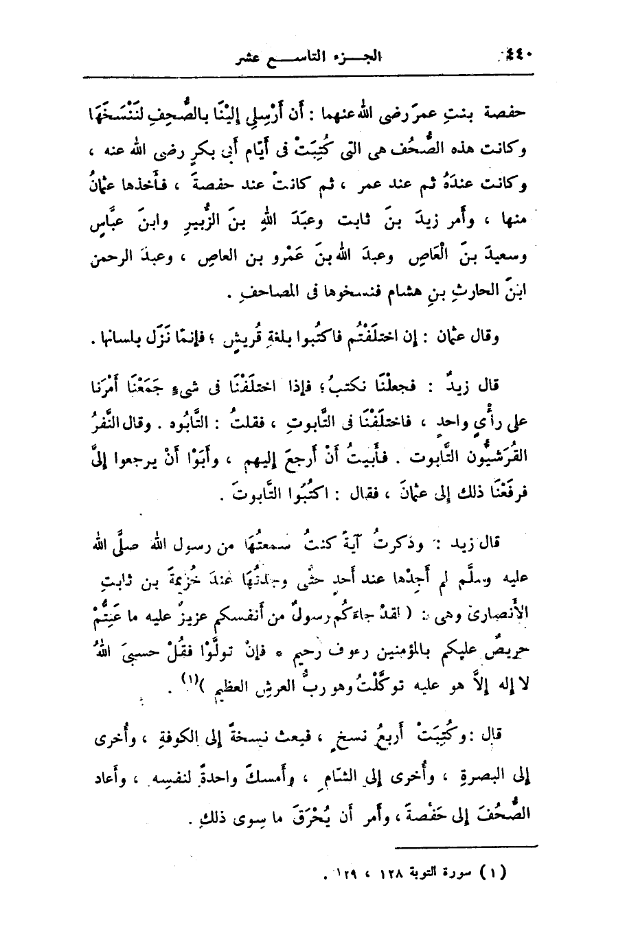 حفصة بنت عمر رضى الله عنهما: أن أرسلى إلينا بالصّحف لننسخها وكانت هذه الصّحف هى التى كتبت فى أيّام أبى بكر رضى الله عنه، وكانت عنده ثم عند عمر، ثم كانت عند حفصة، فأخذها عثمان منها، وأمر زيد بن ثابت وعبد الله بن الزّبير وابن عبّاس وسعيد بن العاص وعبد الله بن عمرو بن العاص، وعبد الرحمن ابن الحارث بن هشام فنسخوها فى المصاحف.