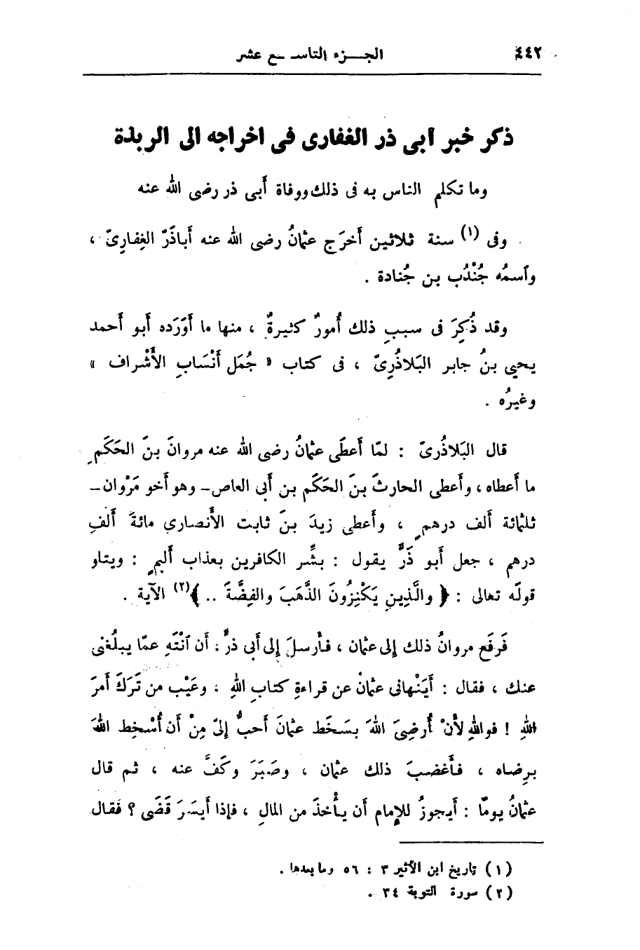 وما تكلم الناس به فى ذلك ووفاة أبى ذر رضى الله عنه وفى [1] سنة ثلاثين أخرج عثمان رضى الله عنه أباذرّ الغفارىّ، واسمه جندب بن جنادة.