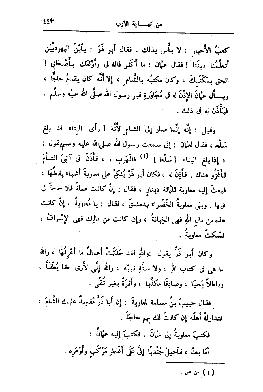 كعب الأحبار: لا بأس بذلك. فقال أبو ذرّ: يابن اليهوديّين أتعلّمنا ديننا! فقال عثمان: ما أكثر ذاك لى وأولعك بأصحابى! الحق بمكتبك، وكان مكتبه بالشّام، إلا أنّه كان يقدم حاجّا، ويسأل عثمان الإذن له فى مجاورة قبر رسول الله صلّى الله عليه وسلّم، فأذن له فى ذلك.