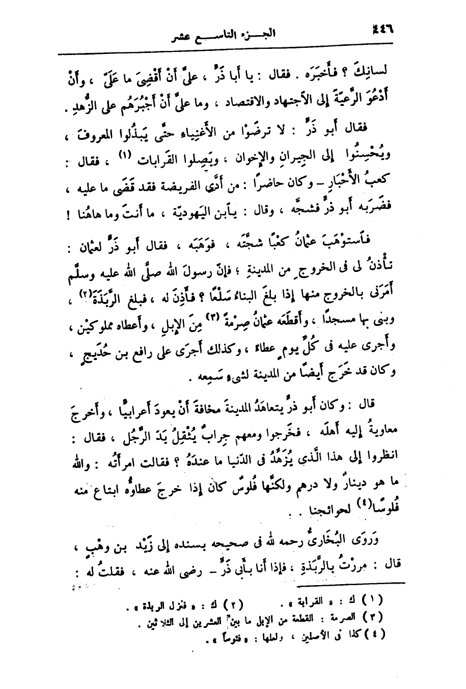 وروى البخارىّ رحمه الله فى صحيحه بسنده إلى زيد بن وهب، قال: مررت بالرّبذة، فإذا أنا بأبى ذرّ- رضى الله عنه، فقلت له: