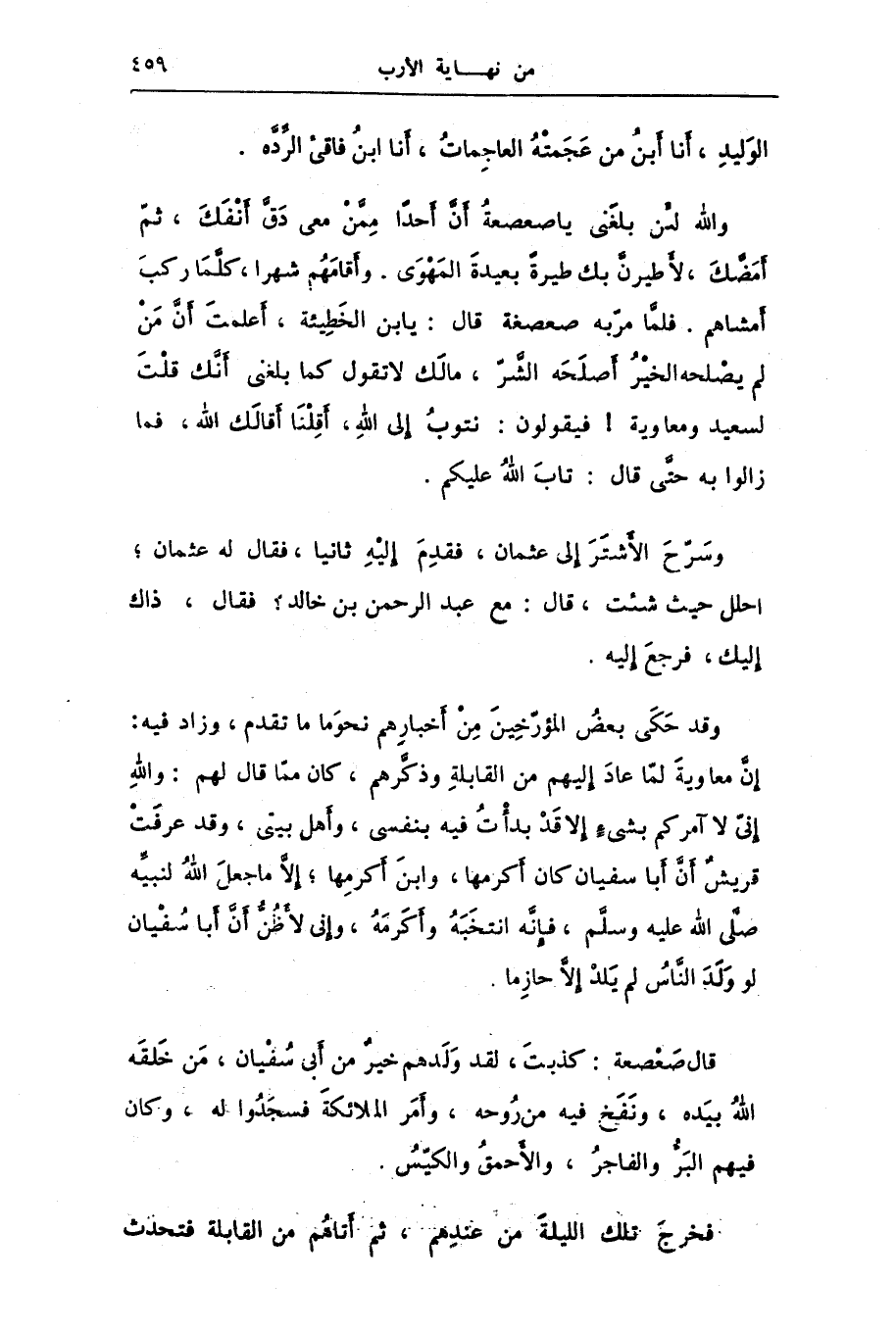 قال صعصعة: كذبت، لقد ولدهم خير من أبى سفيان، من خلقه الله بيده، ونفخ فيه من روحه، وأمر الملائكة فسجدوا له، وكان فيهم البرّ والفاجر، والأحمق والكيّس.