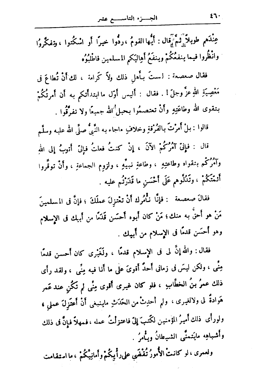 عندهم طويلا ثمّ قال: أيّها القوم، ردّوا خيرا أو اسكتوا، وتفكّروا وانظروا فيما ينفعكم وينفع أهاليكم المسلمين فاطلبوه فقال صعصعة: لست بأهل ذلك ولا كرامة، لك أن تطاع فى معصية الله عزّ وجلّ!. فقال: أليس أوّل ما ابتدأتكم به أن أمرتكم بتقوى الله وطاعته وأن تعتصموا بحبل الله جميعا ولا تفرّقوا.