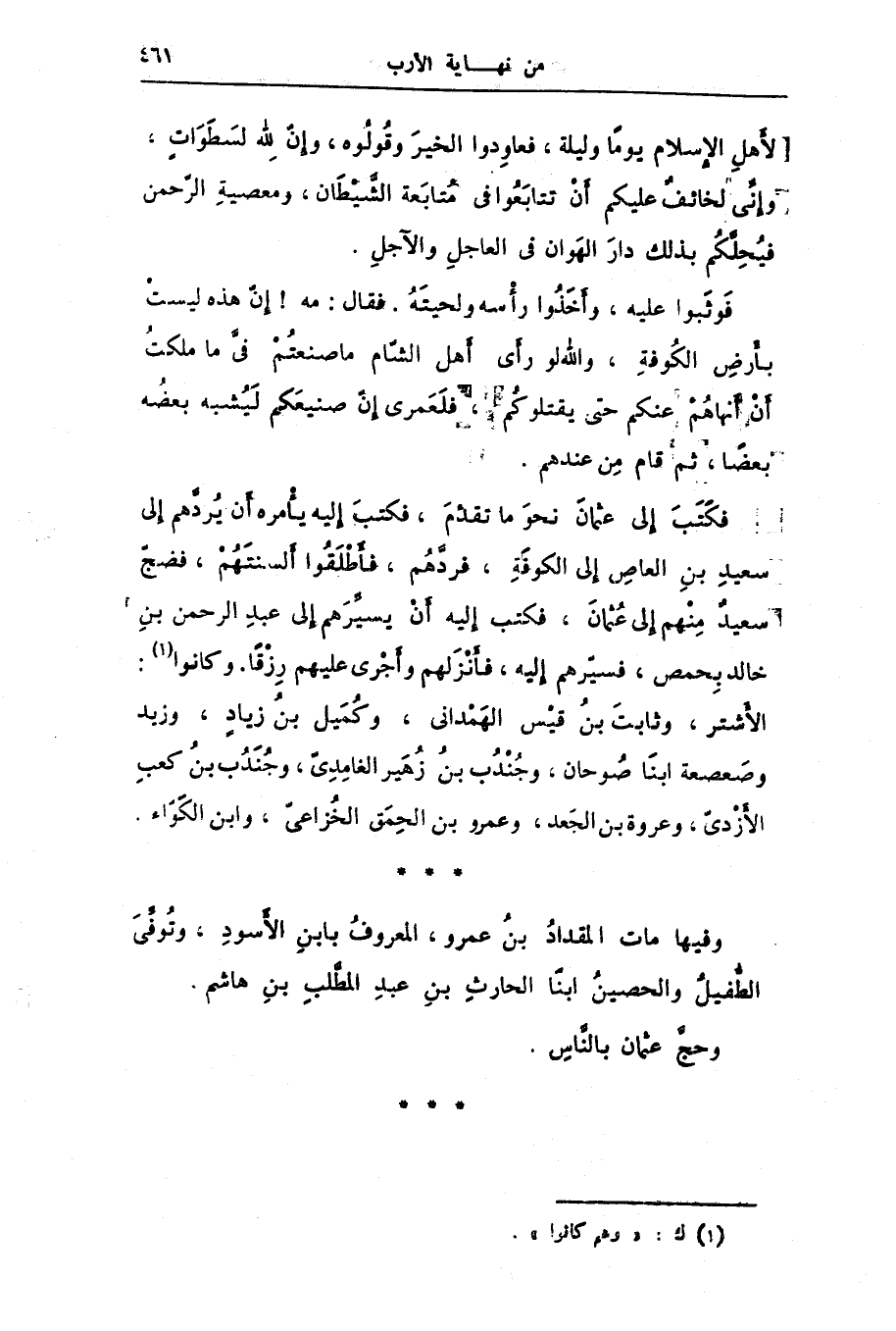فكتب إلى عثمان نحو ما تقدّم، فكتب إليه يأمره أن يردّهم إلى سعيد بن العاص إلى الكوفة، فردّهم، فأطلقوا ألسنتهم، فضجّ سعيد منهم إلى عثمان، فكتب إليه أن يسيّرهم إلى عبد الرحمن بن خالد بحمص، فسيّرهم إليه، فأنزلهم وأجرى عليهم رزقا. وكانوا [1] :