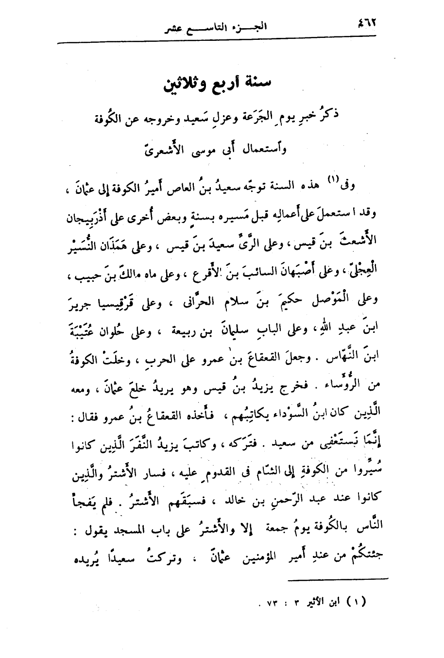 سنة أربع وثلاثين ذكر خبر يوم الجرعة وعزل سعيد وخروجه عن الكوفة واستعمال أبى موسى الأشعرىّ
