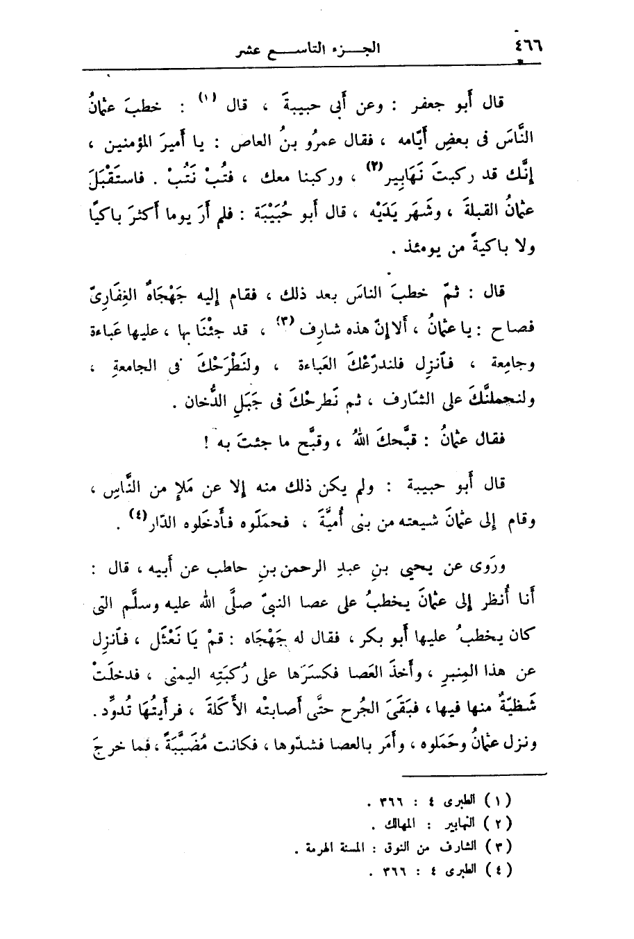 قال أبو جعفر: وعن أبى حبيبة، قال [1] : خطب عثمان النّاس فى بعض أيّامه، فقال عمرو بن العاص: يا أمير المؤمنين، إنّك قد ركبت نهابير [2] ، وركبنا معك، فتب نتب. فاستقبل عثمان القبلة، وشهر يديه، قال أبو حبيبة: فلم أر يوما أكثر باكيا ولا باكية من يومئذ.