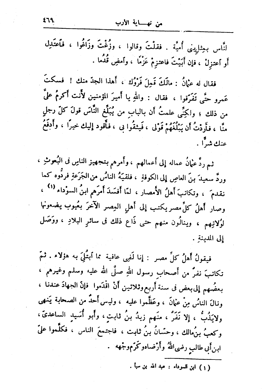 فيقول أهل كلّ مصر: إنا لفى عافية مما ابتلى به هؤلاء. ثمّ تكاتب نفر من أصحاب رسول الله صلّى الله عليه وسلم وغيرهم، بعضهم إلى بعض فى سنة أربع وثلاثين أن اقدموا فإنّ الجهاد عندنا، ونال الناس من عثمان، وعظّموا عليه، وليس أحد من الصحابة ينهى ولا يذبّ، إلا نفر، منهم زيد بن ثابت، وأبو أسيد الساعدىّ، وكعب بن مالك، وحسّان بن ثابت، فاجتمع الناس، فكلّموا علىّ ابن أبى طالب رضى الله وأرضاه وكرّم وجهه.