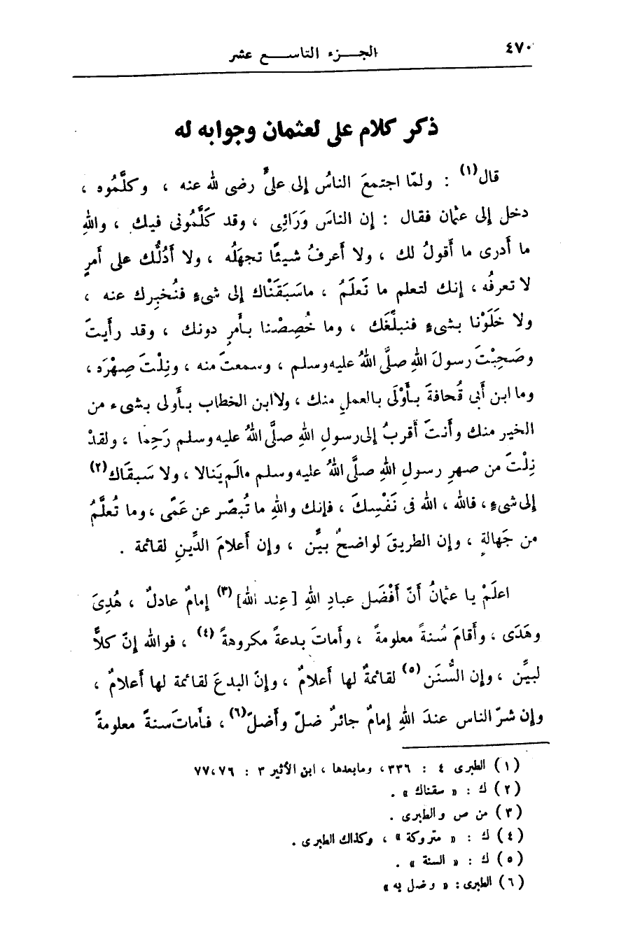 اعلم يا عثمان أنّ أفضل عباد الله [عند الله] [3] إمام عادل، هدى وهدى، وأقام سنة معلومة، وأمات بدعة مكروهة [4] ، فو الله إنّ كلّا لبيّن، وإن السّنن [5] لقائمة لها أعلام، وإنّ البدع لقائمة لها أعلام، وإن شرّ الناس عند الله إمام جائر ضلّ وأضلّ [6] ، فأمات سنة معلومة