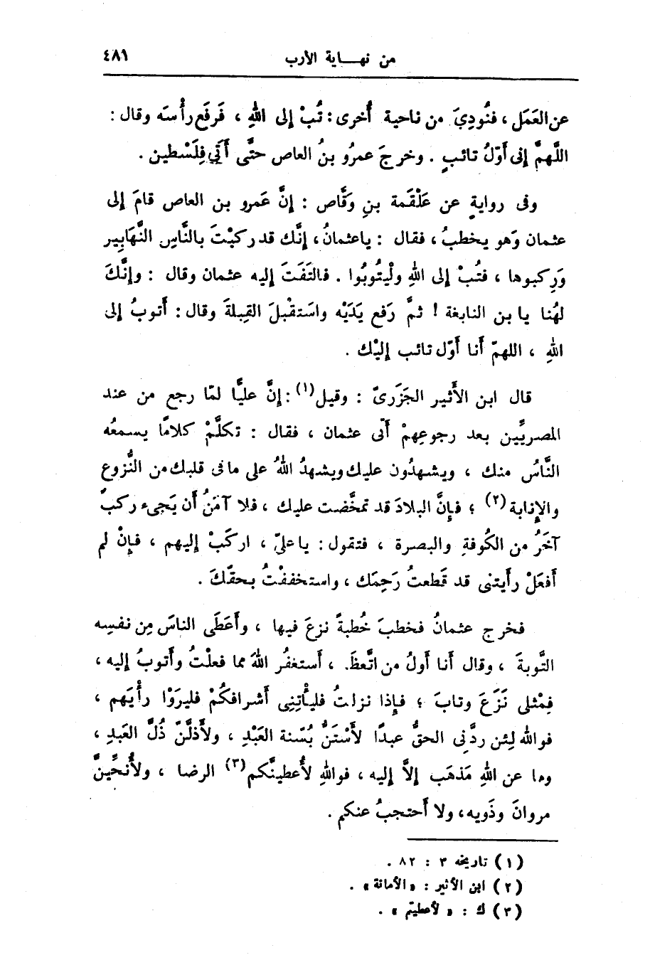 وفى رواية عن علقمة بن وقّاص: إنّ عمرو بن العاص قام إلى عثمان وهو يخطب، فقال: يا عثمان، إنّك قد ركبت بالنّاس النّهابير وركبوها، فتب إلى الله وليتوبوا. فالتفت إليه عثمان وقال: وإنّك لهنا يابن النابغة! ثمّ رفع يديه واستقبل القبلة وقال: أتوب إلى الله، اللهمّ أنا أوّل تائب إليك.