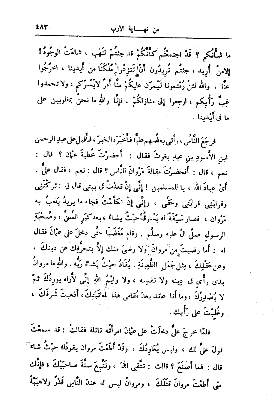 أى عباد الله، يا للمسلمين! إنّى إن قعدت فى بيتى قال لى: تركتنى وقرابتى قرابتى وحقّى، وإنّى إن تكلّمت فجاء ما يريد يلعب به مروان، فصار سيّقة له يسوقه حيث يشاء، بعد كبر السّنّ، وصحبة الرسول صلّى الله عليه وسلّم. وقام مغضبا حتّى دخل على عثمان فقال له: أما رضيت من مروان ولا رضى منك إلّا بتحرّفك عن دينك، وعن عقلك، مثل جمل الظّعينة. يقاد حيث يشاء ربّه. والله ما مروان بذى رأى فى دينه ولا نفسه، ولا وايم الله إنّى لأراه يوردك ثمّ لا يصدرك، وما أنا عائد بعد مقامى هذا لمعاتبتك، أذهبت شرفك، وغلبت على رأيك.