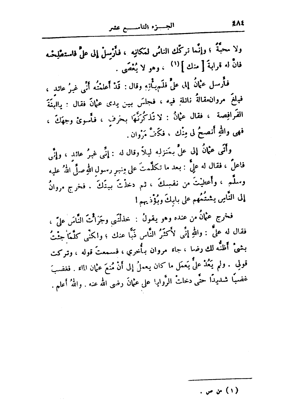 وأتى عثمان إلى علىّ بمنزله ليلا وقال له: إنّى غير عائد، وإنّى فاعل، فقال له علىّ: بعد ما تكلّمت على منبر رسول الله صلّى الله عليه وسلّم، وأعطيت من نفسك، ثم دخلت بيتك، فخرج مروان إلى النّاس يشتمهم على بابك ويؤذيهم! فخرج عثمان من عنده وهو يقول: خذلتنى وجرأت النّاس علىّ، فقال له علىّ: والله إنّى لأكثر النّاس ذبّا عنك؛ ولكنّى كلّما جئت بشئ أظنّه لك رضا، جاء مروان بأخرى، فسمعت قوله، وتركت قولى. ولم يعد علىّ يعمل ما كان يعمل إلى أن منع عثمان الماء. فغضب غضبا شديدا حتّى دخلت الرّوايا على عثمان رضى الله عنه. والله أعلم.