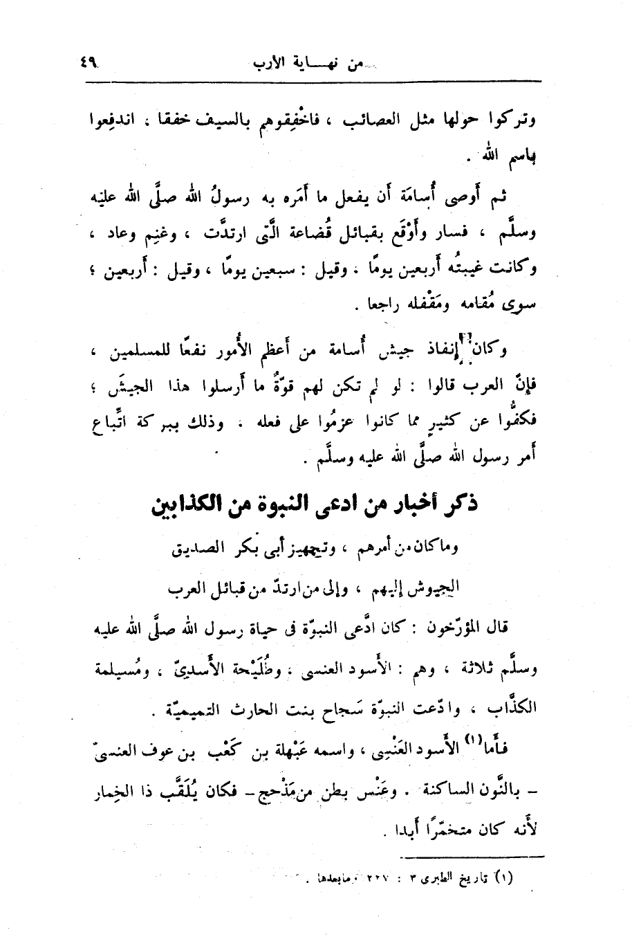 وما كان من أمرهم، وتجهيز أبى بكر الصديق الجيوش إليهم، وإلى من ارتدّ من قبائل العرب قال المؤرّخون: كان ادّعى النبوّة فى حياة رسول الله صلّى الله عليه وسلّم ثلاثة، وهم: الأسود العنسى، وطليحة الأسدىّ، ومسيلمة الكذّاب، وادّعت النبوّة سجاح بنت الحارث التميميّة.