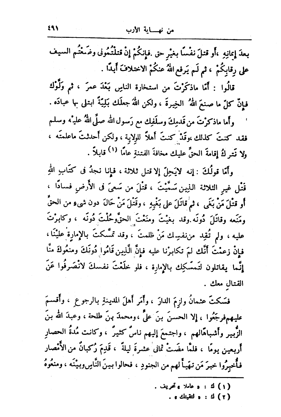 وأمّا قولك: إنه لا يحلّ إلا قتل ثلاثة، فإنا نجد فى كتاب الله قتل غير الثلاثة الذين سمّيت، قتل من سعى فى الأرض فسادا، أو قتل من بغى، ثم قاتل على بغيه، وقتل من حال دون شىء من الحقّ ومنعه وقاتل دونه. وقد بغيت ومنعت الحقّ وحلت دونه، وكابرت عليه، ولم تقد من نفسك من ظلمت، وقد تمسّكت بالإمارة علينا، فإن زعمت أنّك لم تكابرنا عليه فإنّ الّذين قاموا دونك ومنعوك منّا إنّما يقاتلون لتمسّك بالإمارة، فلو خلعت نفسك لانصرفوا عن القتال معك.
