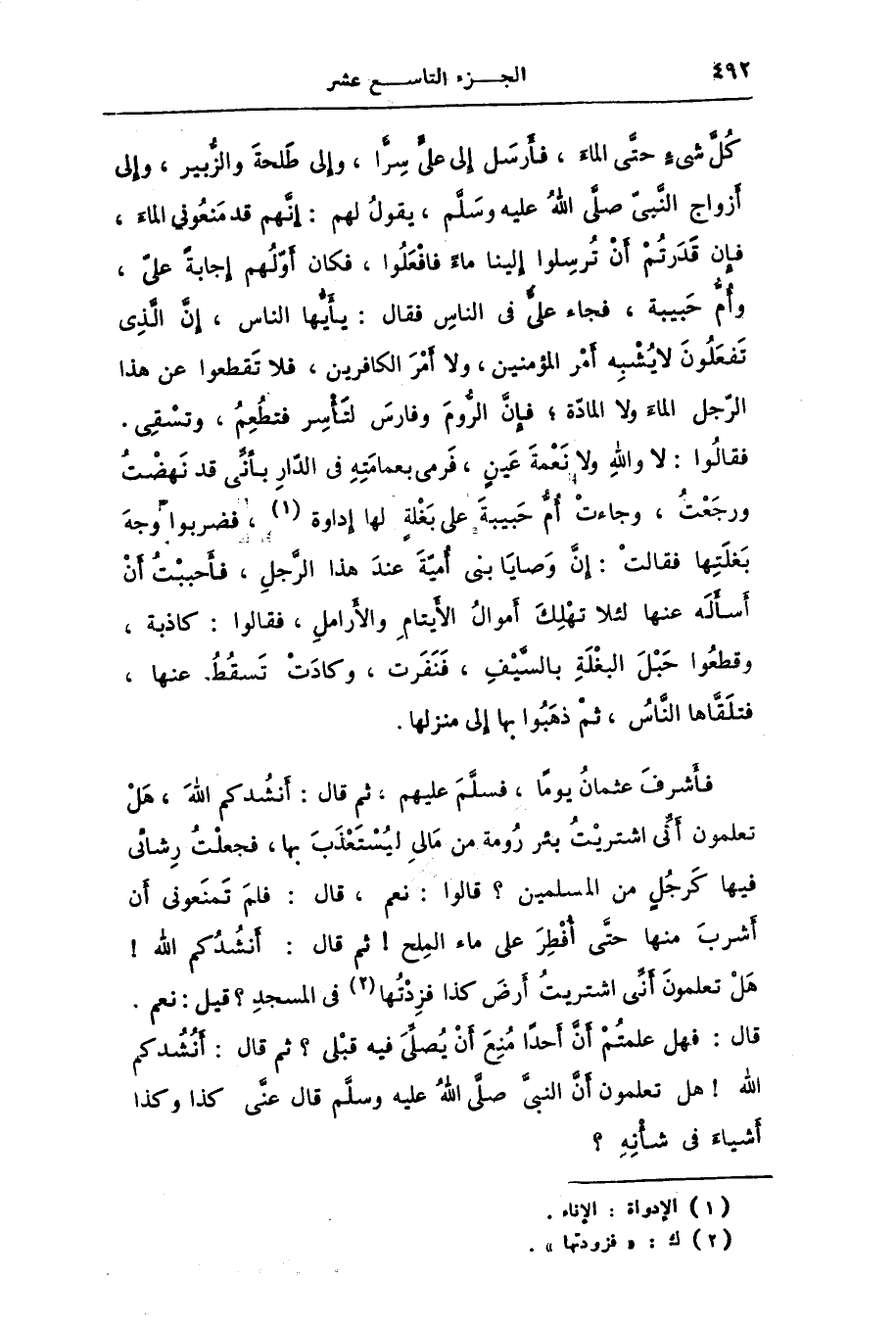 فأشرف عثمان يوما، فسلّم عليهم، ثم قال: أنشدكم الله، هل تعلمون أنّى اشتريت بئر رومة من مالى ليستعذب بها، فجعلت رشائى فيها كرجل من المسلمين؟ قالوا: نعم، قال: فلم تمنعونى أن أشرب منها حتّى أفطر على ماء الملح! ثم قال: أنشدكم الله! هل تعلمون أنّى اشتريت أرض كذا فزدتها [2] فى المسجد؟ قيل: نعم.