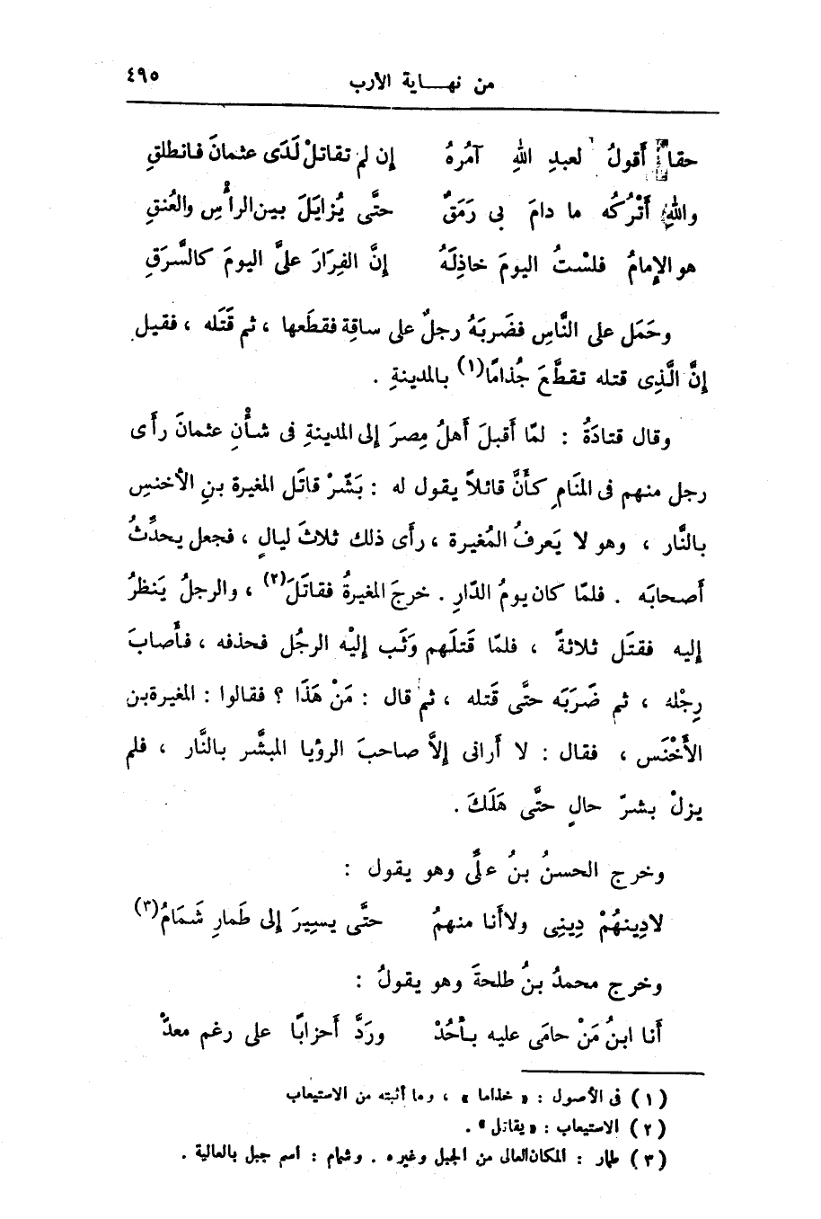 وقال قتادة: لمّا أقبل أهل مصر إلى المدينة فى شأن عثمان رأى رجل منهم فى المنام كأنّ قائلا يقول له: بشّر قاتل المغيرة بن الأخنس بالنّار، وهو لا يعرف المغيرة، رأى ذلك ثلاث ليال، فجعل يحدّث أصحابه. فلمّا كان يوم الدّار. خرج المغيرة فقاتل [2] ، والرجل ينظر إليه فقتل ثلاثة، فلمّا قتلهم وثب إليه الرجل فحذفه، فأصاب رجله، ثم ضربه حتّى قتله، ثم قال: من هذا؟ فقالوا: المغيرة بن الأخنس، فقال: لا أرانى إلّا صاحب الرؤيا المبشّر بالنّار، فلم يزل بشرّ حال حتّى هلك.
