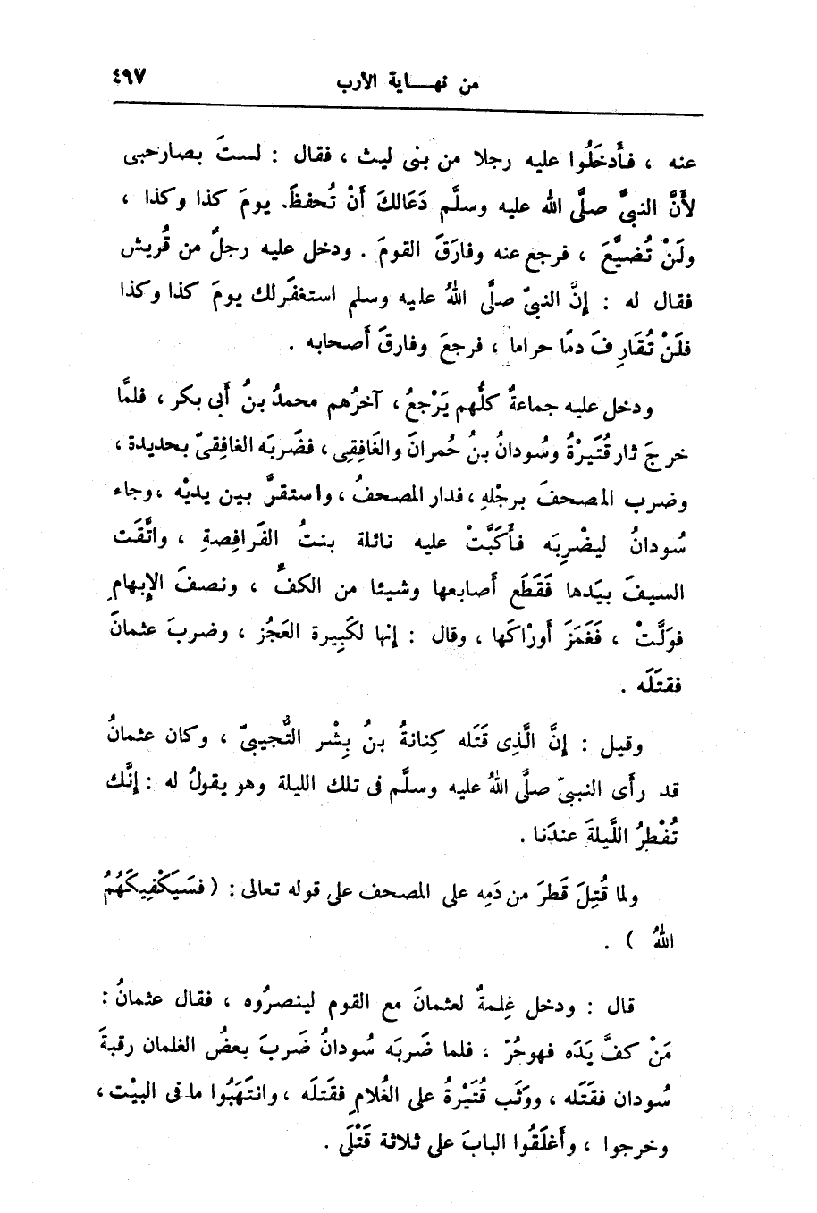 ودخل عليه جماعة كلّهم يرجع، آخرهم محمد بن أبى بكر، فلمّا خرج ثار قتيرة وسودان بن حمران والغافقى، فضربه الغافقىّ بحديدة، وضرب المصحف برجله، فدار المصحف، واستقرّ بين يديه، وجاء سودان ليضربه فأكبّت عليه نائلة بنت الفرافصة، واتّقت السيف بيدها فقطع أصابعها وشيئا من الكفّ، ونصف الإبهام فولّت، فغمز أوراكها، وقال: إنها لكبيرة العجز، وضرب عثمان فقتله.