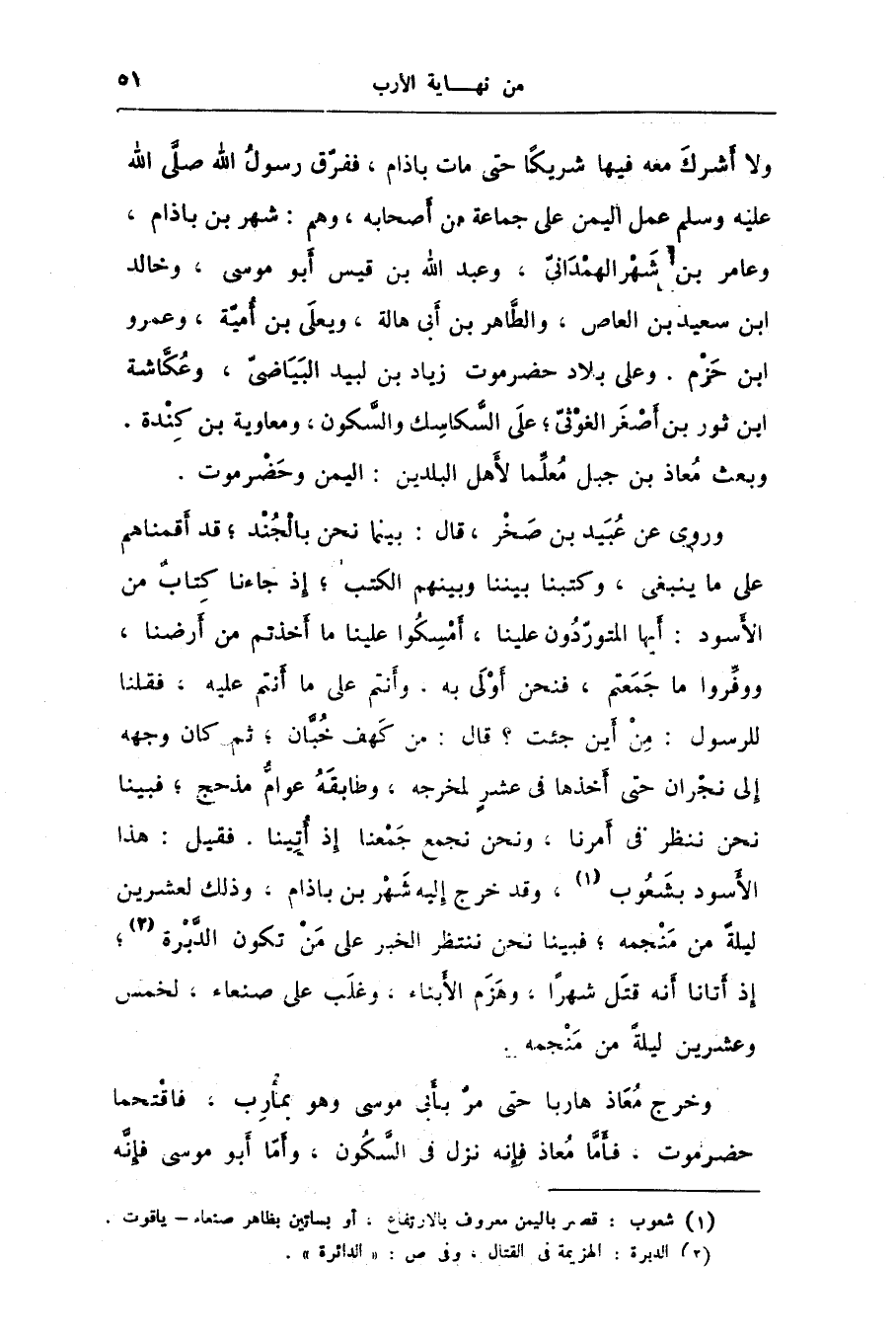 وروى عن عبيد بن صخر، قال: بينما نحن بالجند؛ قد أقمناهم على ما ينبغى، وكتبنا بيننا وبينهم الكتب؛ إذ جاءنا كتاب من الأسود: أيها المتورّدون علينا، أمسكوا علينا ما أخذتم من أرضنا، ووفّروا ما جمعتم، فنحن أولى به. وأنتم على ما أنتم عليه، فقلنا للرسول: من أين جئت؟ قال: من كهف خبّان؛ ثم كان وجهه إلى نجران حتى أخذها فى عشر لمخرجه، وطابقه عوامّ مذحج؛ فبينا نحن ننظر فى أمرنا، ونحن نجمع جمعنا إذ أتينا. فقيل: هذا الأسود بشعوب [1] ، وقد خرج إليه شهر بن باذام، وذلك لعشرين ليلة من منجمه؛ فبينا نحن ننتظر الخبر على من تكون الدّبرة [2] ؛ إذ أتانا أنه قتل شهرا، وهزم الأبناء، وغلب على صنعاء، لخمس وعشرين ليلة من منجمه.