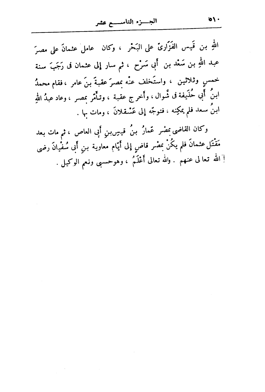 وكان القاضى بمصر عّمار بن قيس بن أبى العاص، ثم مات بعد مقتل عثمان فلم يكن بمصر قاض إلى أيّام معاوية بن أبى سفيان رضى الله تعالى عنهم. والله تعالى أعلم، وهو حسبى ونعم الوكيل.