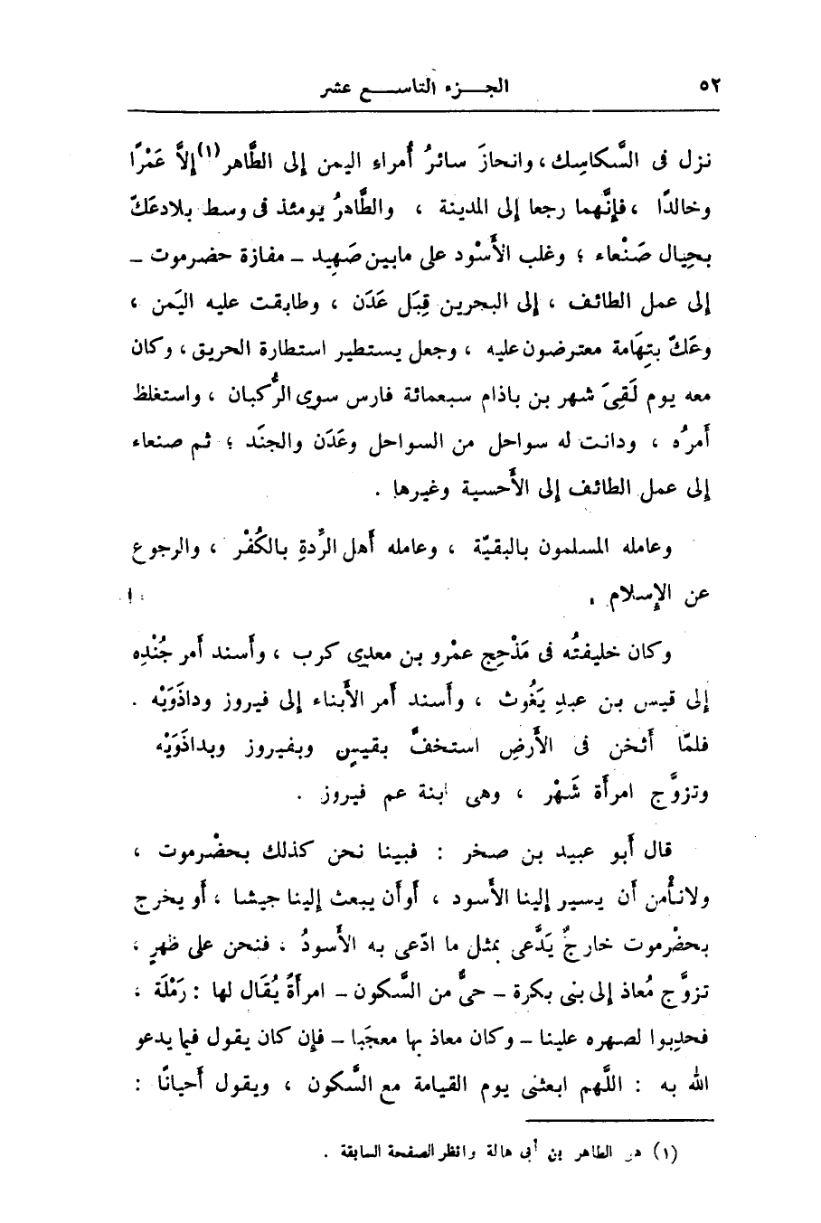 نزل فى السّكاسك، وانحاز سائر أمراء اليمن إلى الطّاهر [1] إلّا عمرا وخالدا، فإنّهما رجعا إلى المدينة، والطّاهر يومئذ فى وسط بلادعك بحيال صنعاء؛ وغلب الأسود على ما بين صهيد- مفازة حضرموت- إلى عمل الطائف، إلى البحرين قبل عدن، وطابقت عليه اليمن، وعكّ بتهامة معترضون عليه، وجعل يستطير استطارة الحريق، وكان معه يوم لقى شهر بن باذام سبعمائة فارس سوى الرّكبان، واستغلظ أمره، ودانت له سواحل من السواحل وعدن والجند؛ ثم صنعاء إلى عمل الطائف إلى الأحسية وغيرها.