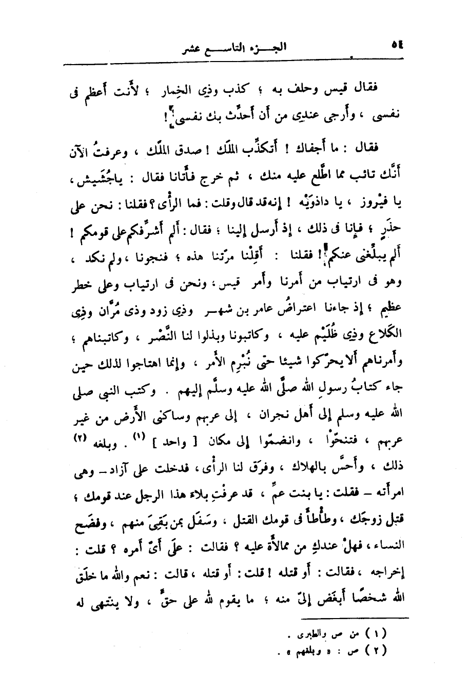 فقال قيس وحلف به؛ كذب وذى الخمار؛ لأنت أعظم فى نفسى، وأرجى عندى من أن أحدّث بك نفسى! فقال: ما أجفاك! أتكذّب الملك! صدق الملك، وعرفت الآن أنّك تائب مما اطّلع عليه منك، ثم خرج فأتانا فقال: يا جشيش، يا فيروز، يا داذويه! إنه قد قال وقلت: فما الرأى؟ فقلنا: نحن على حذر؛ فإنا فى ذلك، إذ أرسل إلينا؛ فقال: ألم أشرّفكم على قومكم! ألم يبلّغنى عنكم! فقلنا: أقلنا مرّتنا هذه؛ فنجونا، ولم نكد، وهو فى ارتياب من أمرنا وأمر قيس، ونحن فى ارتياب وعلى خطر عظيم؛ إذ جاءنا اعتراض عامر بن شهر وذى زود وذى مرّان وذى الكلاع وذى ظليم عليه، وكاتبونا وبذلوا لنا النّصر، وكاتبناهم؛ وأمرناهم ألا يحرّكوا شيئا حتى نبرم الأمر، وإنما اهتاجوا لذلك حين جاء كتاب رسول الله صلّى الله عليه وسلّم إليهم. وكتب النبى صلى الله عليه وسلم إلى أهل نجران، إلى عربهم وساكنى الأرض من غير عربهم، فتنحّوا، وانضمّوا إلى مكان [واحد] [1] . وبلغه [2] ذلك، وأحسّ بالهلاك، وفرق لنا الرأى، فدخلت على آزاد- وهى امرأته- فقلت: يا بنت عمّ، قد عرفت بلاء هذا الرجل عند قومك؛ قتل زوجك، وطأطأ فى قومك القتل، وسفل بمن بقى منهم، وفضح النساء، فهل عندك من ممالأة عليه؟ فقالت: على أىّ أمره؟ قلت: