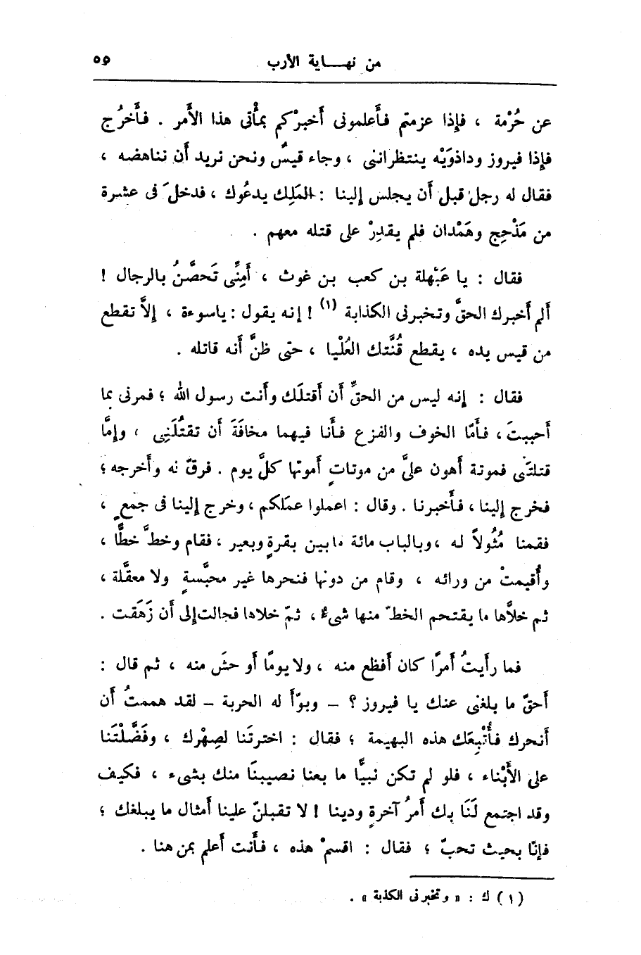 عن حرمة، فإذا عزمتم فأعلمونى أخبركم بمأتى هذا الأمر. فأخرج فإذا فيروز وداذويه ينتظراننى، وجاء قيس ونحن نريد أن نناهضه، فقال له رجل قبل أن يجلس إلينا: الملك يدعوك، فدخل فى عشرة من مذحج وهمدان فلم يقدر على قتله معهم.
