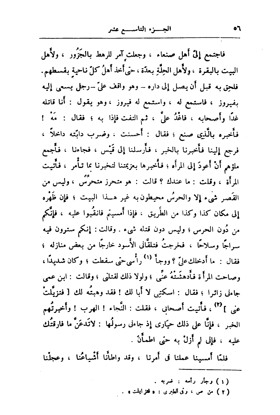 فلحق به قبل أن يصل إلى داره- وهو واقف علىّ- رجل يسعى إليه بفيروز، فاستمع له، واستمع له فيروز، وهو يقول: أنا قاتله غدا وأصحابه، فاغد علىّ، ثم التفت فإذا به؛ فقال: مه! فأخبره بالّذى صنع؛ فقال: أحسنت، وضرب دابّته داخلا، فرجع إلينا فأخبرنا بالخبر، فأرسلنا إلى قيس، فجاءنا، فأجمع ملؤهم أن أعود إلى المرأه؛ فأخبرها بعزيمتنا لتخبرنا بما تأمر، فأتيت المرأة، وقلت: ما عندك؟ قالت: هو متحرز متحرّس، وليس من القصر شىء إلا والحرس محيطون به غير هذا البيت؛ فإن ظهره إلى مكان كذا وكذا من الطّريق، فإذا أمسيتم فانقلبوا عليه، فإنّكم من دون الحرس؛ وليس دون قتله شىء. وقالت: إنكم سترون فيه سراجا وسلاحا، فخرجت فتلقّانى الأسود خارجا من بعض منازله؛ فقال: ما أدخلك علىّ؟ ووجأ [1] رأسى حتى سقطت؛ وكان شديدا، وصاحت المرأة فأدهشته عنّى؛ ولولا ذلك لقتلنى؛ وقالت: ابن عمى جاءنى زائرا؛ فقال: اسكتى لا أبا لك! فقد وهبته لك [فتزيّلت عنى] [2] ، فأتيت أصحابى، فقلت: النّجاء! الهرب! وأخبرتهم الخبر، فإنّا على ذلك حيارى إذ جاءنى رسولها: لا تدعنّ ما فارقتك عليه، فإنى لم أزل به حتى اطمأنّ.