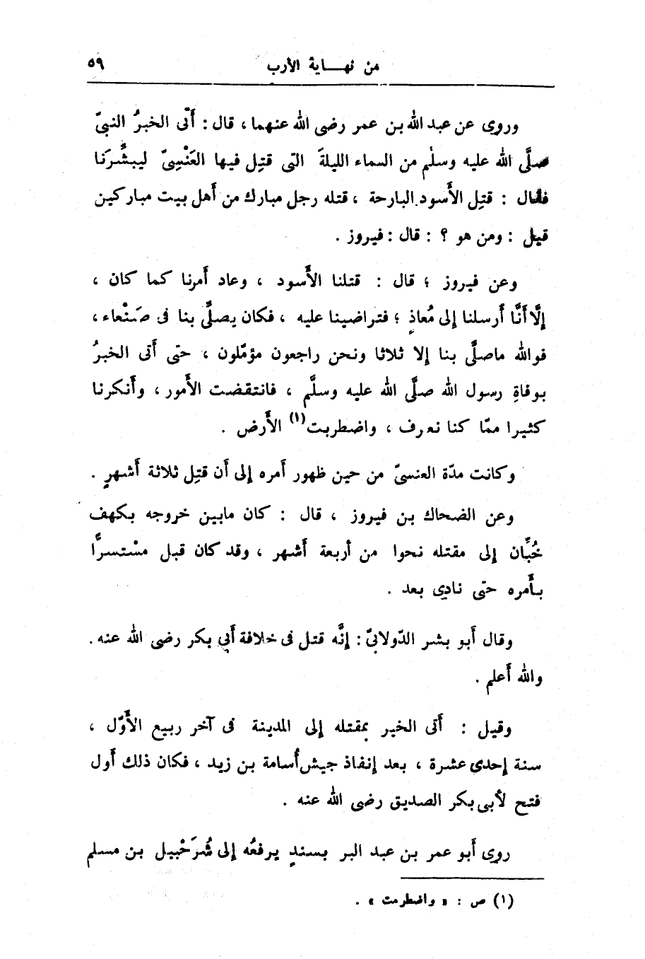 وروى عن عبد الله بن عمر رضى الله عنهما، قال: أتى الخبر النبىّ صلّى الله عليه وسلّم من السماء الليلة التى قتل فيها العنسىّ ليبشّرنا فقال: قتل الأسود البارحة، قتله رجل مبارك من أهل بيت مباركين قيل: ومن هو؟: قال: فيروز.