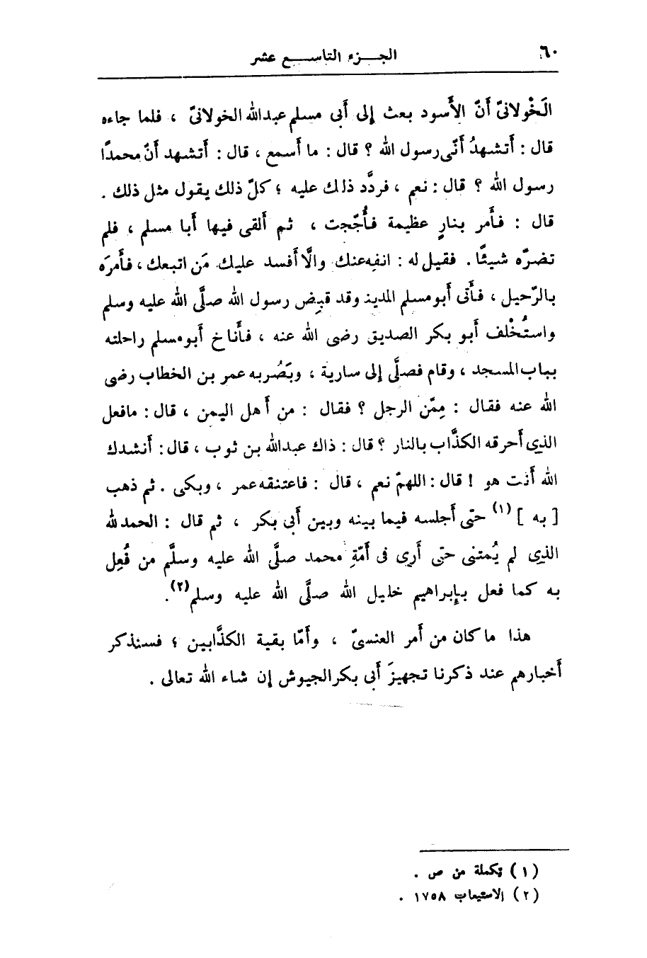 قال: فأمر بنار عظيمة فأجّجت، ثم ألقى فيها أبا مسلم، فلم تضرّه شيئا. فقيل له: انفه عنك والّا أفسد عليك من اتبعك، فأمره بالرّحيل، فأتى أبو مسلم المدينة وقد قبض رسول الله صلّى الله عليه وسلّم واستخلف أبو بكر الصديق رضى الله عنه، فأناخ أبو مسلم راحلته بباب المسجد، وقام فصلّى إلى سارية، وبصربه عمر بن الخطاب رضى الله عنه فقال: ممّن الرجل؟ فقال: من أهل اليمن، قال: ما فعل الذى أحرقه الكذّاب بالنار؟ قال: ذاك عبد الله بن ثوب، قال: أنشدك الله أنت هو! قال: اللهمّ نعم، قال: فاعتنقه عمر، وبكى. ثم ذهب [به] [1] حتى أجلسه فيما بينه وبين أبى بكر، ثم قال: الحمد لله الذى لم يمتنى حتى أرى فى أمّة محمد صلّى الله عليه وسلّم من فعل به كما فعل بإبراهيم خليل الله صلّى الله عليه وسلّم [2] .