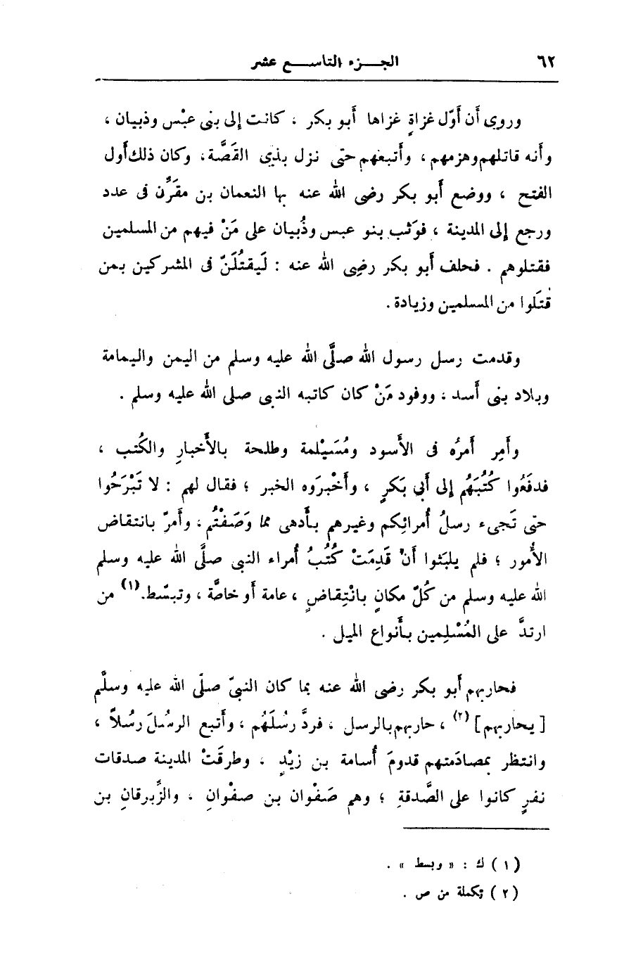 فحاربهم أبو بكر رضى الله عنه بما كان النبىّ صلّى الله عليه وسلّم [يحاربهم] [2] ، حاربهم بالرسل، فردّ رسلهم، وأتبع الرسل رسلا، وانتظر بمصادمتهم قدوم أسامة بن زيد، وطرقت المدينة صدقات نفر كانوا على الصّدقة؛ وهم صفوان بن صفوان، والزّبرقان بن