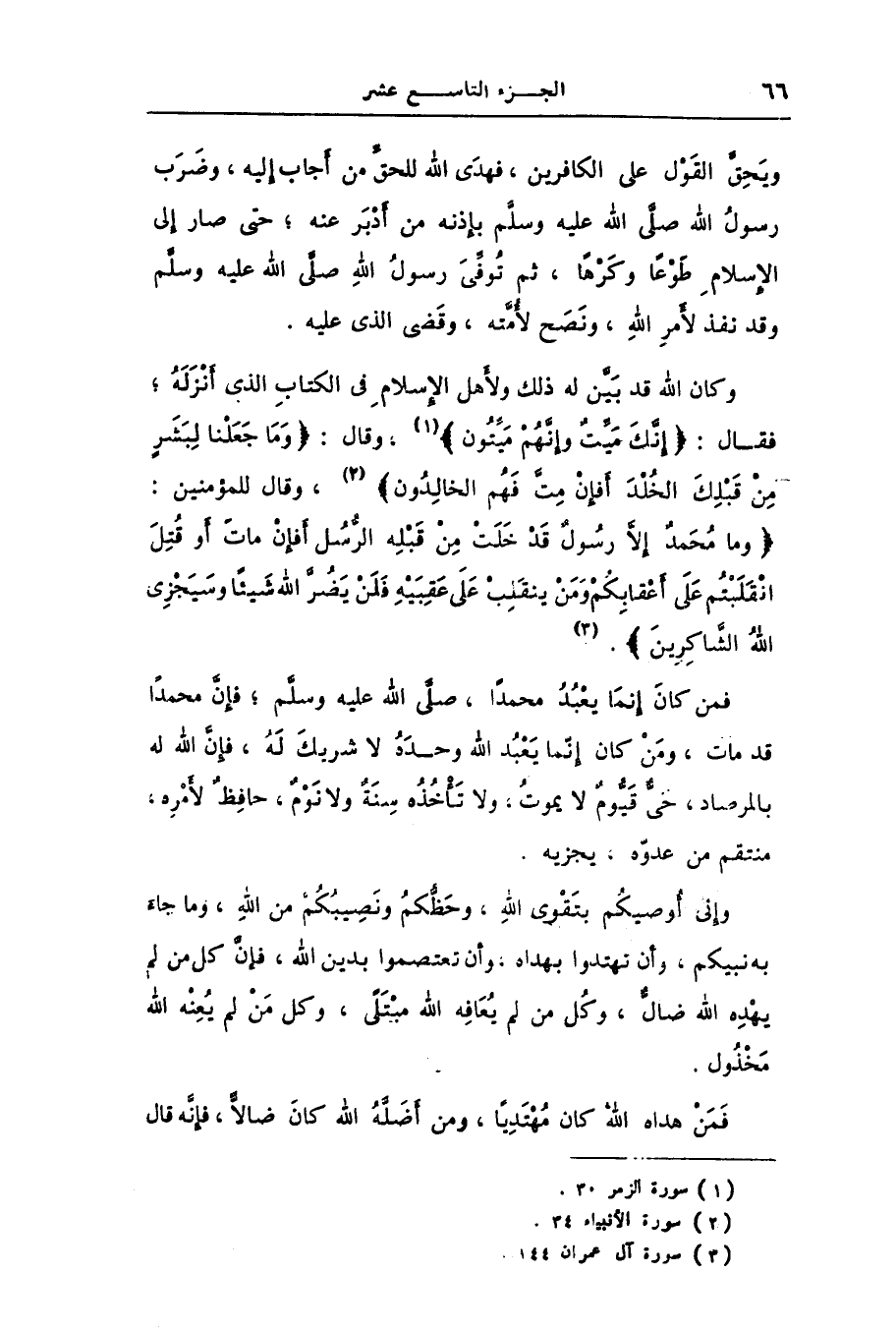 وَما مُحَمَّدٌ إِلَّا رَسُولٌ قَدْ خَلَتْ مِنْ قَبْلِهِ الرُّسُلُ أَفَإِنْ ماتَ أَوْ قُتِلَ انْقَلَبْتُمْ عَلى أَعْقابِكُمْ وَمَنْ يَنْقَلِبْ عَلى عَقِبَيْهِ فَلَنْ يَضُرَّ اللَّهَ شَيْئاً وَسَيَجْزِي اللَّهُ الشَّاكِرِينَ