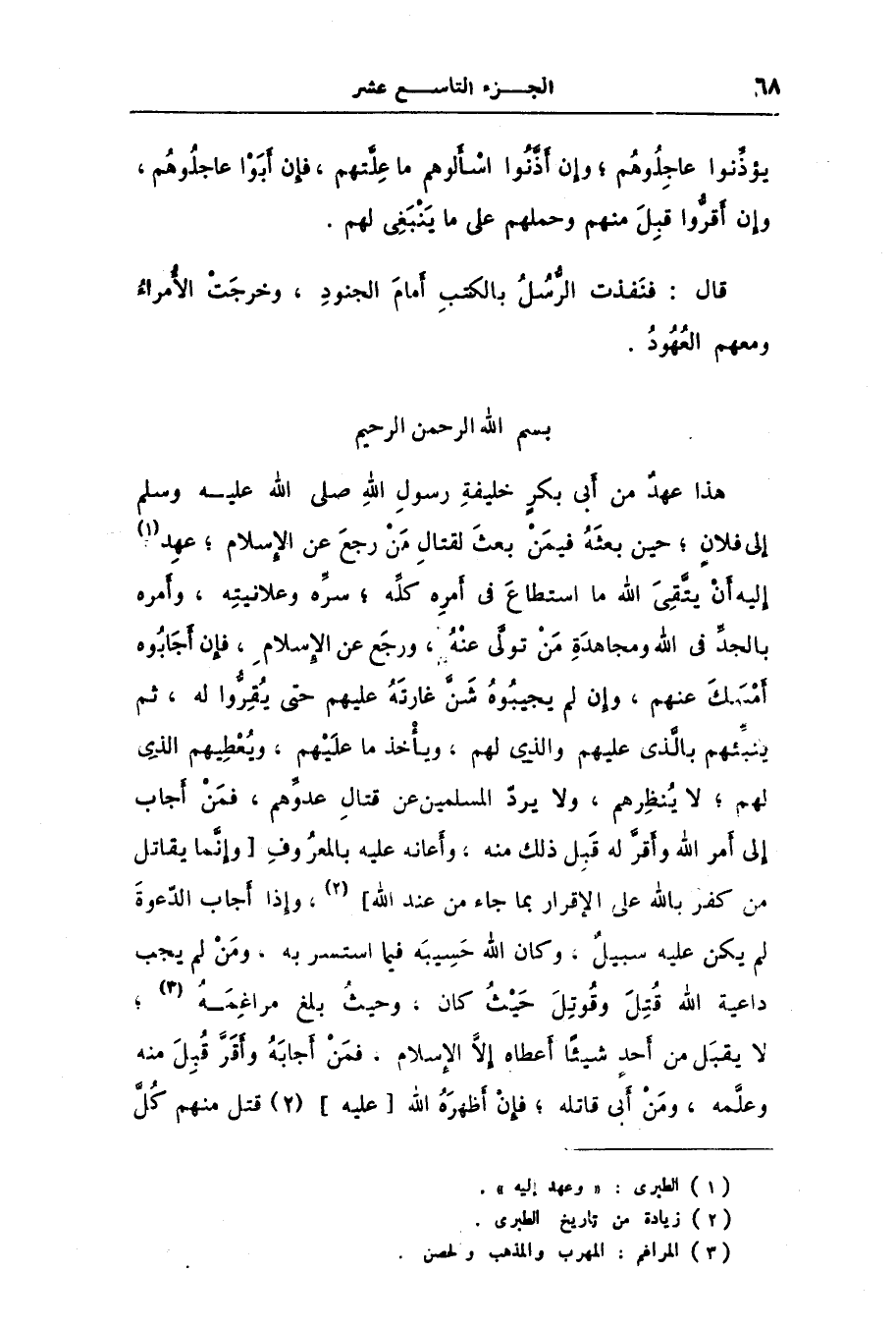 بسم الله الرحمن الرحيم هذا عهد من أبى بكر خليفة رسول الله صلى الله عليه وسلّم إلى فلان؛ حين بعثه فيمن بعث لقتال من رجع عن الإسلام؛ عهد [1] إليه أن يتّقى الله ما استطاع فى أمره كلّه؛ سرّه وعلانيته، وأمره بالجدّ فى الله ومجاهدة من تولّى عنه، ورجع عن الإسلام، فإن أجابوه أمسك عنهم، وإن لم يجيبوه شنّ غارته عليهم حتى يقرّوا له، ثم ينبّئهم بالّذى عليهم والذى لهم، ويأخذ ما عليهم، ويعطيهم الذى لهم؛ لا ينظرهم، ولا يردّ المسلمين عن قتال عدوّهم، فمن أجاب إلى أمر الله وأقرّ له قبل ذلك منه، وأعانه عليه بالمعروف [وإنّما يقاتل من كفر بالله على الإقرار بما جاء من عند الله] [2] ، وإذا أجاب الدّعوة لم يكن عليه سبيل، وكان الله حسيبه فيما استسر به، ومن لم يجب داعية الله قتل وقوتل حيث كان، وحيث بلغ مراغمه [3] ؛ لا يقبل من أحد شيئا أعطاه إلّا الإسلام، فمن أجابه وأقرّ قبل منه وعلّمه، ومن أبى قاتله؛ فإن أظهره الله [عليه] [2] قتل منهم كلّ