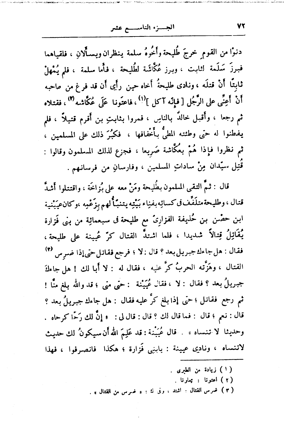 قال: ثمّ التقى المسلمون بطليحة ومن معه على بزاخة، واقتتلوا أشدّ قتال، وطليحة متلفّف فى كسائه بفناء بيته يتنبّأ لهم بزعمه، وكان عيينية ابن حصن بن حذيفة الفزارىّ مع طليحة فى سبعمائة من بنى فزارة يقاتل قتالا شديدا، فلما اشتدّ القتال كرّ عيينة على طليحة، فقال: هل جاءك جبريل بعد؟ قال: لا؛ فرجع فقاتل حتى إذا ضرس [3] القتال، وهزّته الحرب كرّ عليه، فقال له: لا أبا لك! هل جاءك جبريل بعد؟ فقال: لا، فقال عيينة: حتى متى؛ قد والله بلغ منّا! ثم رجع فقاتل؛ حتى إذا بلغ كرّ عليه فقال: هل جاءك جبريل بعد؟