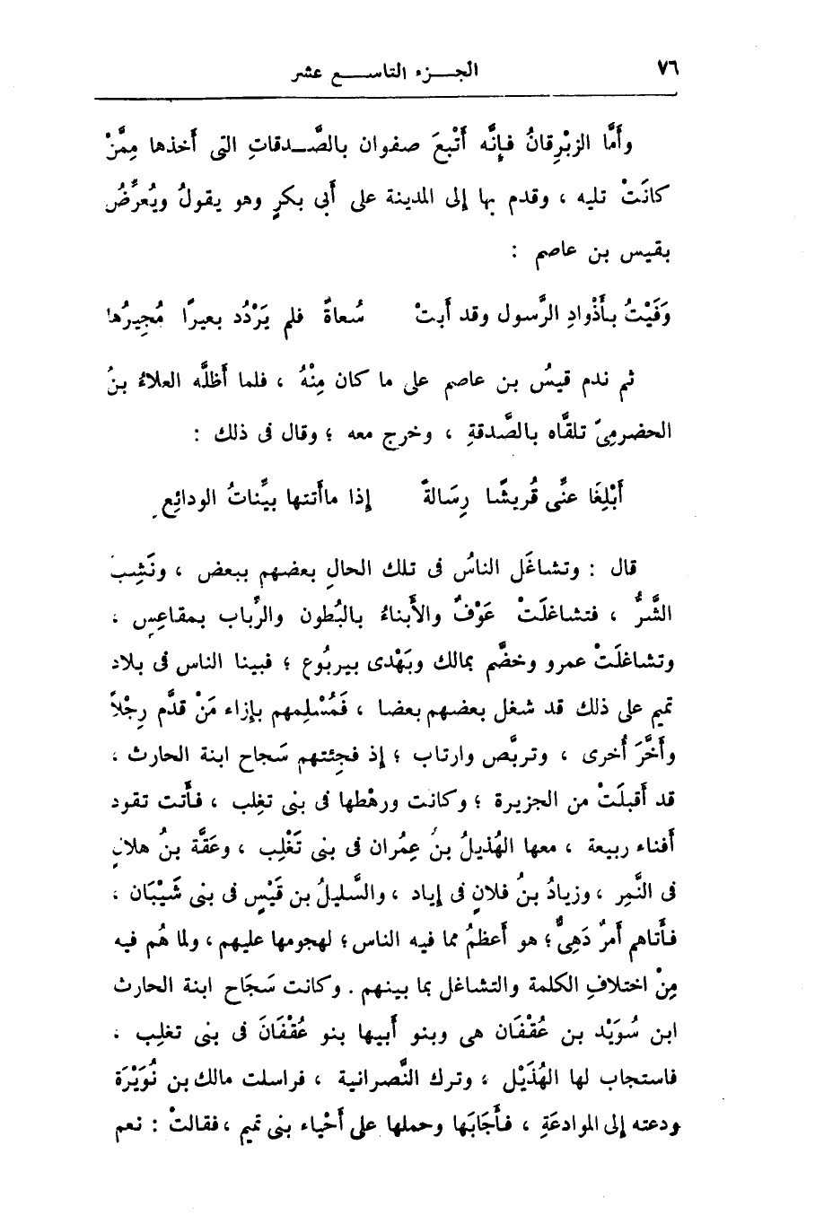 وأمّا الزبرقان فإنّه أتبع صفوان بالصّدقات التى أخذها ممّن كانت تليه، وقدم بها إلى المدينة على أبى بكر وهو يقول ويعرّض بقيس بن عاصم: