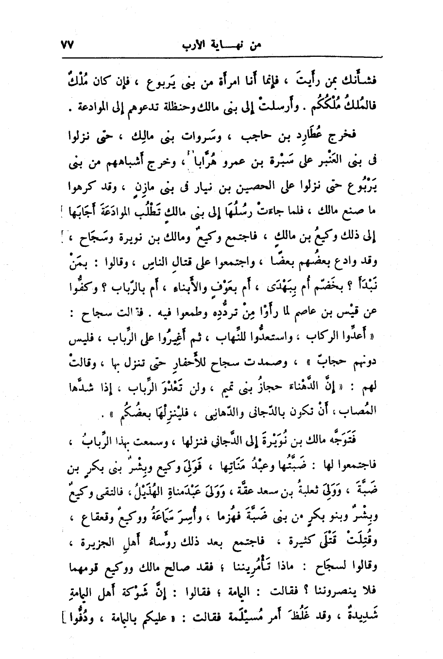 «أعدّوا الركاب، واستعدّوا للنّهاب، ثم أغيروا على الرّباب، فليس دونهم حجابّ» ، وصمدت سجاح للأحفار حتى تنزل بها، وقالت لهم: «إنّ الدّهناء حجاز بنى تميم، ولن تعدو الرّباب، إذا شدّها المصاب، أن تكون بالدّجانى والدّهانى، فلينزلها بعضكم» .