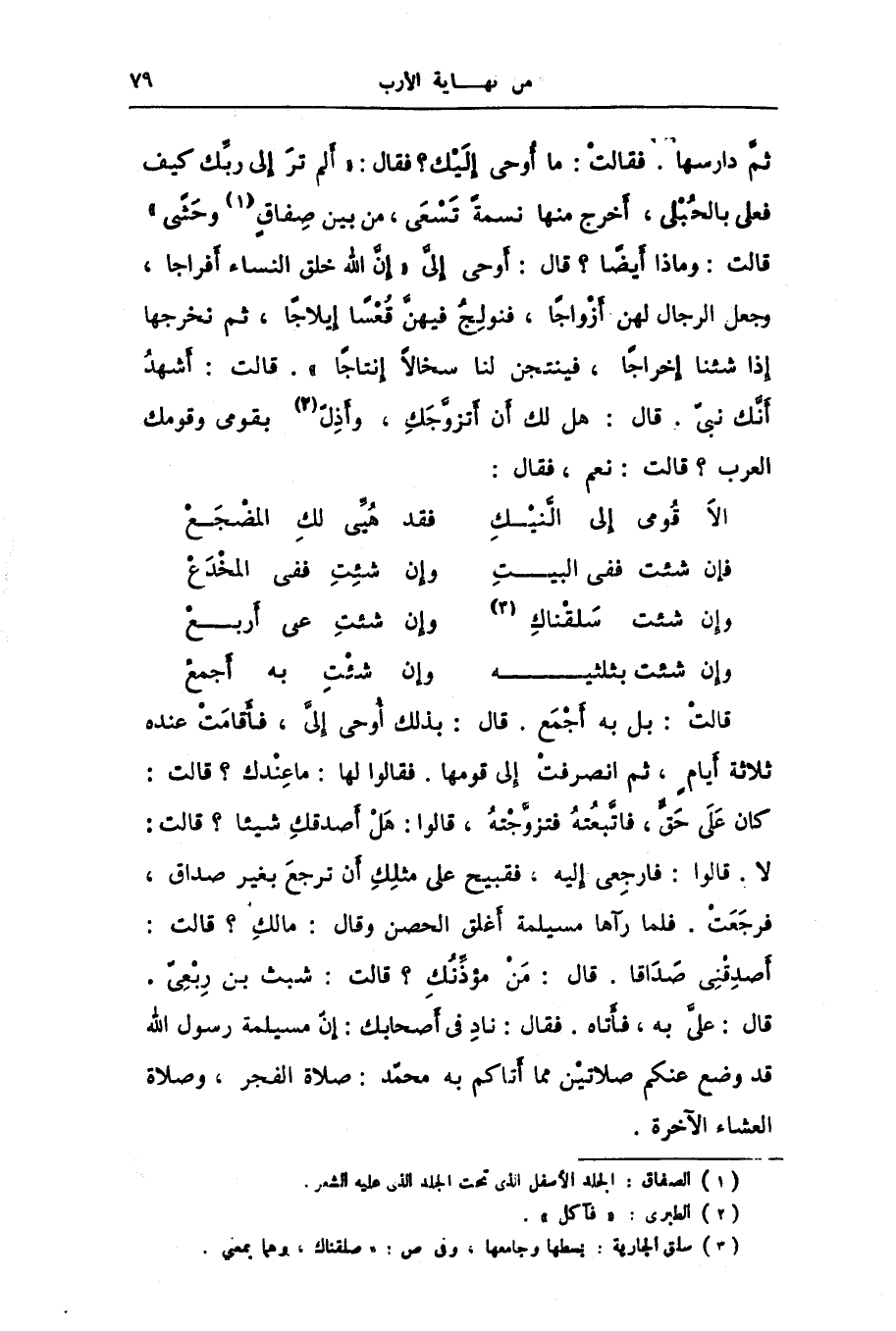 ثمّ دارسها. فقالت: ما أوحى إليك؟ فقال: «ألم تر إلى ربّك كيف فعلى بالحبلى، أخرج منها نسمة تسعى، من بين صفاق [1] وحشى» قالت: وماذا أيضا؟ قال: أوحى إلىّ «إنّ الله خلق النساء أفراجا، وجعل الرجال لهن أزواجا، فنولج فيهنّ قعسا إيلاجا، ثم نخرجها إذا شئنا إخراجا، فينتجن لنا سخالا إنتاجا» . قالت: أشهد أنّك نبىّ. قال: هل لك أن أتزوّجك، وأذلّ [2] بقومى وقومك العرب؟ قالت: نعم، فقال: