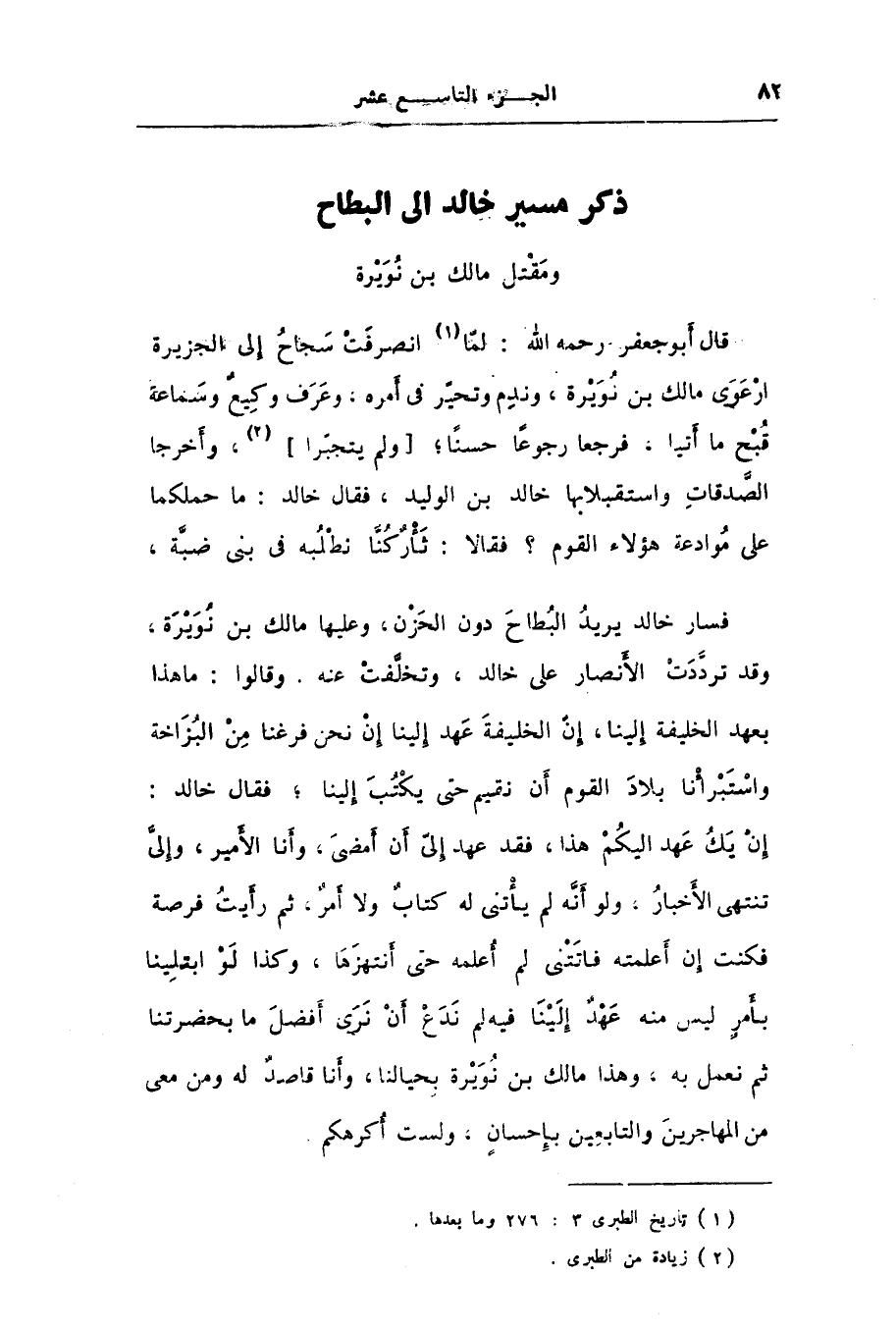 قال أبو جعفر رحمه الله: لمّا [1] انصرفت سجاح إلى الجزيرة ارعوى مالك بن نويرة، وندم وتحيّر فى أمره، وعرف وكيع وسماعة قبح ما أتيا، فرجعا رجوعا حسنا؛ [ولم يتجبّرا] [2] ، وأخرجا الصّدقات واستقبلا بها خالد بن الوليد، فقال خالد: ما حملكما على موادعة هؤلاء القوم؟ فقالا: ثأركنّا نطلبه فى بنى ضبّة، فسار خالد يريد البطاح دون الحزن، وعليها مالك بن نويرة، وقد تردّدت الأنصار على خالد، وتخلّفت عنه. وقالوا: ما هذا بعهد الخليفة إلينا، إنّ الخليفة عهد إلينا إن نحن فرغنا من البزاخة واستبرأنا بلاد القوم أن نقيم حتى يكتب إلينا؛ فقال خالد: