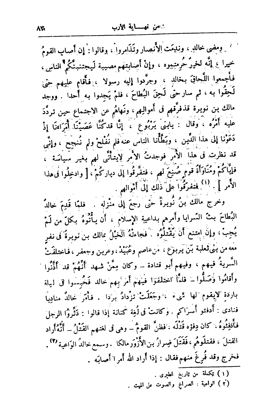 وخرج مالك بن نويرة حتى رجع إلى منزله. فلمّا قدم خالد البطاح بثّ السّرايا وأمرهم بداعية الإسلام، أن يأتوه بكلّ من لم يجب، وإن امتنع أن يقتلوه. فجاءته الخيل بمالك بن نويرة فى نفر معه من بنى ثعلبة بن يربوع، من عاصم وعبيد، وعرين وجعفر، فاختلفت السّرية فيهم، وفيهم أبو قتادة- وكان ممّن شهد أنّهم قد أذّنوا وأقاموا وصلّوا- فلمّا اختلفوا فيهم أمر بهم خالد فحبسوا فى ليلة باردة لا يقوم لها شىء، وجعلت تزداد بردا. فأمر خالد مناديا فنادى: أدفئو أسراكم. وكانت فى لغة كنانة إذا قالوا: دثّروا الرجل فأدفئوه، كان دفؤه قتله، فظنّ القوم- وهى فى لغتهم القتل- أنّه أراد القتل، فقتلوهم، فقتل ضرار بن الأزور مالكا. وسمع خالد الواعية [2] .
