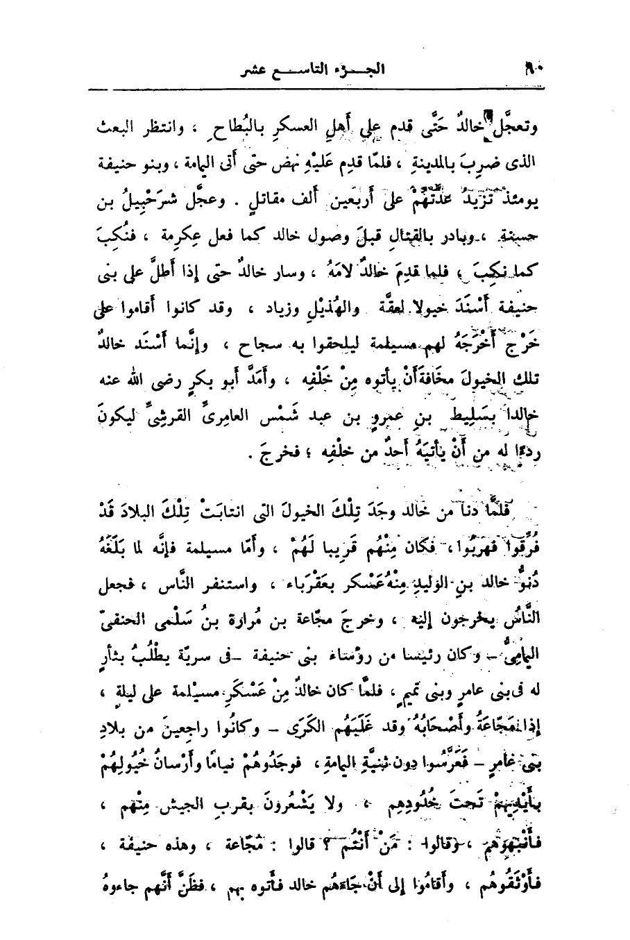 فلمّا دنا من خالد وجد تلك الخيول التى انتابت تلك البلاد قد فرّقوا فهربوا، فكان منهم قريبا لهم، وأمّا مسيلمة فإنّه لما بلغه دنوّ خالد بن الوليد منه عسكر بعقرباء، واستنفر النّاس، فجعل النّاس يخرجون إليه، وخرج مجاعة بن مرارة بن سلمى الحنفىّ اليمامىّ- وكان رئيسا من رؤساء بنى حنيفة- فى سريّة يطلب بثأر له فى بنى عامر وبنى تميم، فلمّا كان خالد من عسكر مسيلمة على ليلة، إذا مجّاعة وأصحابه وقد غلبهم الكرى- وكانوا راجعين من بلاد بنى غامر- فعرّسوا دون ثنيّة اليمامة، فوجدوهم نياما وأرسان خيولهم بأيديهم تحت خدودهم، ولا يشعرون بقرب الجيش منهم، فأنبهوهم، وقالوا: من أنتم؟ قالوا: مجّاعة، وهذه حنيفة، فأوثقوهم، وأقاموا إلى أن جاءهم خالد فأتوه بهم، فظنّ أنّهم جاءوه