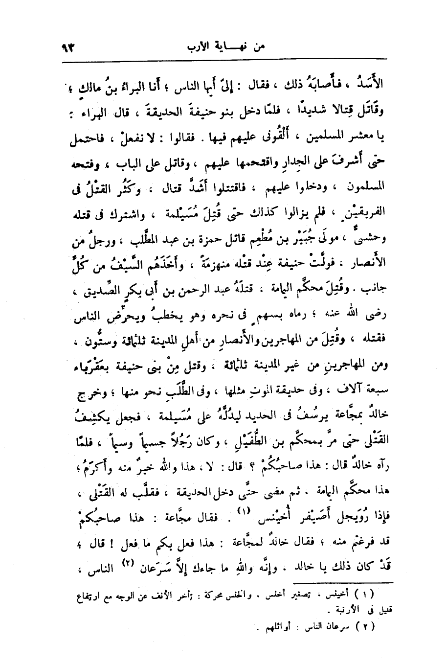 يا معشر المسلمين، ألقونى عليهم فيها. فقالوا: لا نفعل، فاحتمل حتى أشرف على الجدار واقتحمها عليهم، وقاتل على الباب، وفتحه المسلمون، ودخلوا عليهم، فاقتتلوا أشدّ قتال، وكثر القتل فى الفريقين، فلم يزالوا كذلك حتى قتل مسيلمة، واشترك فى قتله وحشىّ، مولى جبير بن مطعم قاتل حمزة بن عبد المطّلب، ورجل من الأنصار، فولّت حنيفة عند قتله منهزمة، وأخذهم السّيف من كلّ جانب. وقتل محكّم اليمامة، قتله عبد الرحمن بن أبى بكر الصّديق، رضى الله عنه؛ رماه بسهم فى نحره وهو يخطب ويحرّض الناس فقتله، وقتل من المهاجرين والأنصار من أهل المدينة ثلاثمائة وستّون، ومن المهاجرين من غير المدينة ثلاثمائة، وقتل من بنى حنيفة بعقرباء سبعة آلاف، وفى حديقة الموت مثلها، وفى الطّلب نحو منها؛ وخرج خالد بمجّاعة يرسف فى الحديد ليدلّه على مسيلمة، فجعل يكشف القتلى حتى مرّ بمحكّم بن الطّفيل، وكان رجلا جسيما وسيما، فلمّا رآه خالد قال: هذا صاحبكم؟ قال: لا، هذا والله خير منه وأكرم؛ هذا محكّم اليمامة. ثم مضى حتّى دخل الحديقة، فقلّب له القتلى، فإذا رويجل أصيفر أخينس [1] . فقال مجّاعة: هذا صاحبكم قد فرغتم منه؛ فقال خالد لمجّاعة: هذا فعل بكم ما فعل! قال؛ قد كان ذلك يا خالد. وإنّه والله ما جاءك إلّا سرعان [2] الناس،