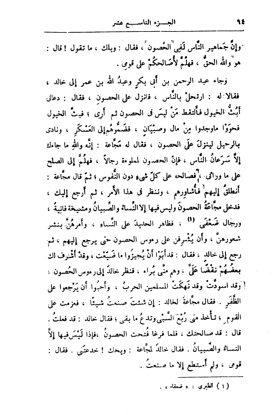 أنطلق إليهم فأشاورهم، وننظر فى هذا الأمر، ثم أرجع إليك، فدخل مجّاعة الحصون وليس فيها إلا النّساء والصّبيان ومشيخة فانية، ورجال ضعفى [1] ، فظاهر الحديد على النّساء، وأمرهنّ بنشر شعورهنّ، وأن يشرفن على رءوس الحصون حتى يرجع إليهم، ثم رجع إلى خالد، فقال: قد أبوا أن يجيزوا ما ضيّعت، وقد أشرف لك بعضهم نقضا علىّ، وهم منّى براء، فنظر خالد إلى رءوس الحصون:
