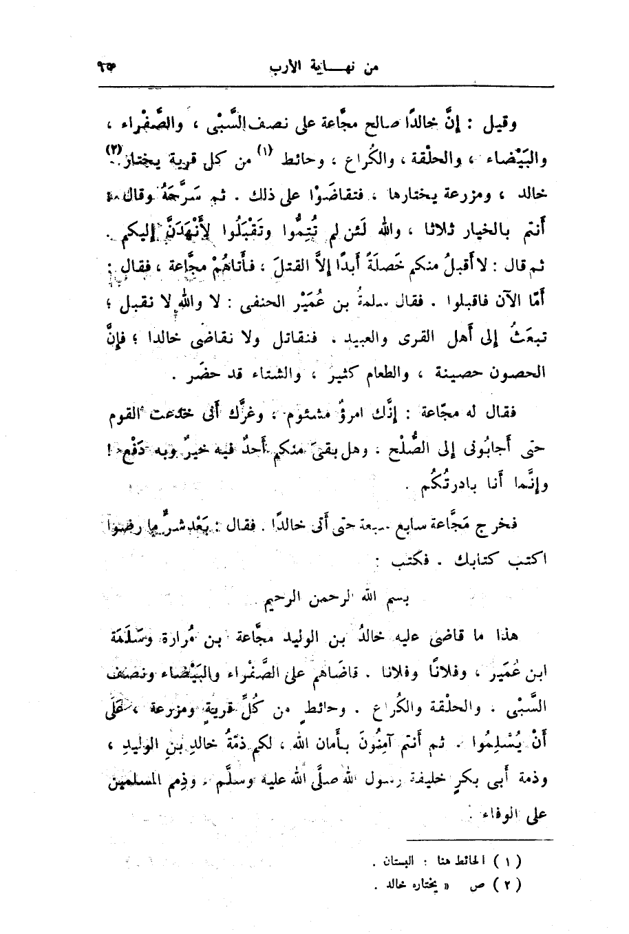 بسم الله الرّحمن الرّحيم هذا ما قاضى عليه خالد بن الوليد مجّاعة بن مرارة وسلمة ابن عمير، وفلانا وفلانا. قاضاهم على الصّفراء والبيضاء ونصف السّبى. والحلقة والكراع. وحائط من كلّ قرية ومزرعة، على أن يسّلموا. ثم أنتم آمنون بأمان الله، لكم ذمّة خالد بن الوليد، وذمة أبى بكر خليفة رسول الله صلّى الله عليه وسلّم، وذمم المسلمين على الوفاء.
