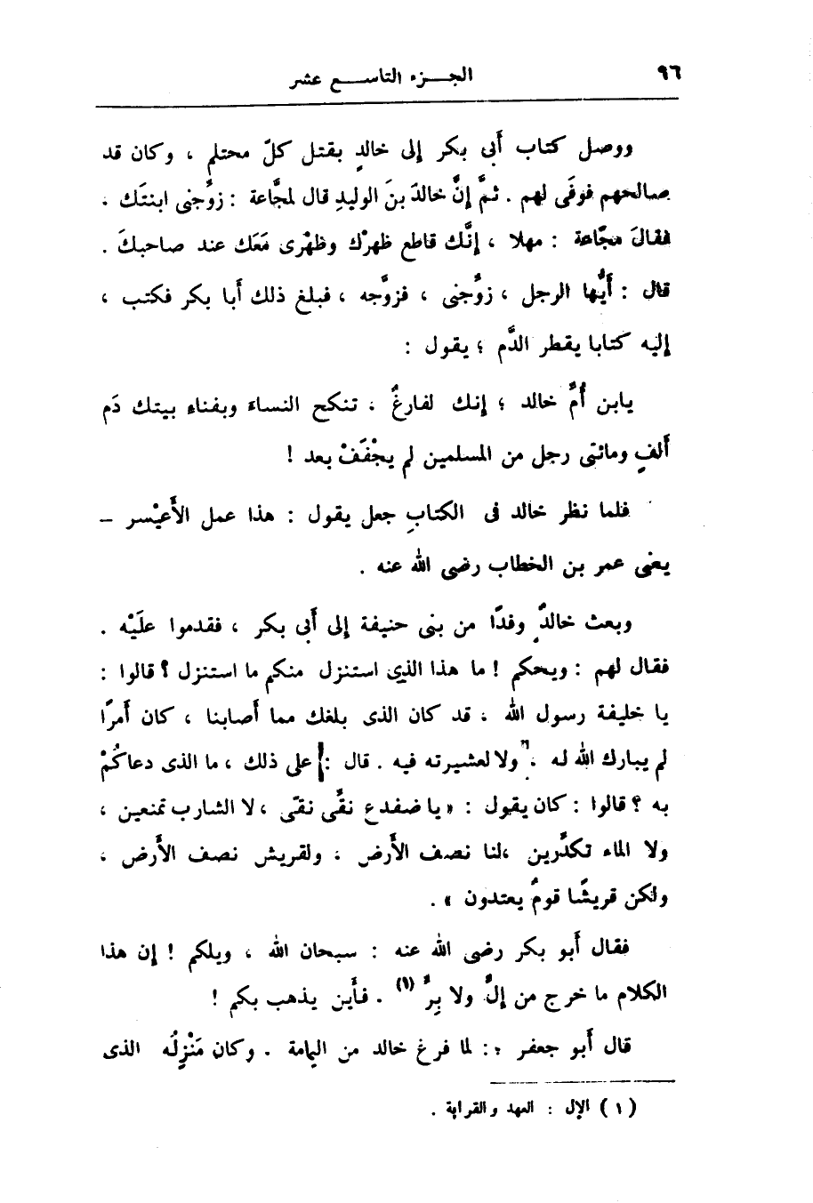 فقال أبو بكر رضى الله عنه: سبحان الله، ويلكم! إن هذا الكلام ما خرج من إلّ ولا برّ [1] . فأين يذهب بكم! قال أبو جعفر: لما فرغ خالد من اليمامة. وكان منزله الذى