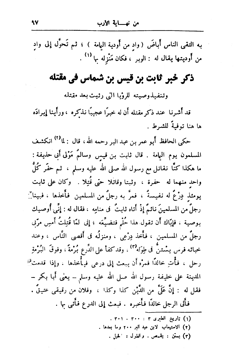 ما هكذا كنّا نقاتل مع رسول الله صلّى الله عليه وسلم، ثم حفر كلّ واحد منهما له حفرة، وثبتا وقاتلا حتى قتلا. وكان على ثابت يومئذ درع له نفيسة، فمرّ به رجل من المسلمين فأخذها، فبينا رجل من المسلمين نائم إذ أتاه ثابت فى منامه، فقال له: إنّى أوصيك بوصية، فإيّاك أن تقول هذا حلم فتضيّعه؛ إنى لمّا قتلت أمس مرّ بى رجل من المسلمين، فأخذ درعى، ومنزله فى أقصى النّاس، وعند خبائه فرس يستنّ فى طوله [3] ، وقد كفأ على الدّرع برمة، وفوق البرمة رحل، فأت خالدا فمره أن يبعث إلى درعى فيأخذها، وإذا قدمت المدينة على خليفة رسول الله صلى الله عليه وسلم- يعنى أبا بكر- فقل له: إنّ علىّ من الدّين كذا وكذا، وفلان من رقيقى عتيق.